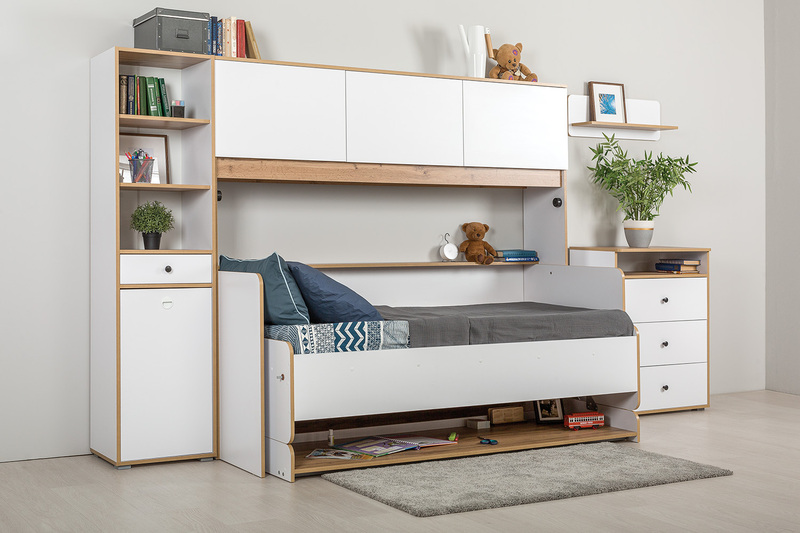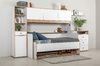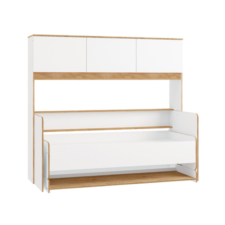 Кровать детская Вуди 11.02 белый премиум, дуб золотой CRAFT, саванна латте, эко 100 кожзам гранд белый