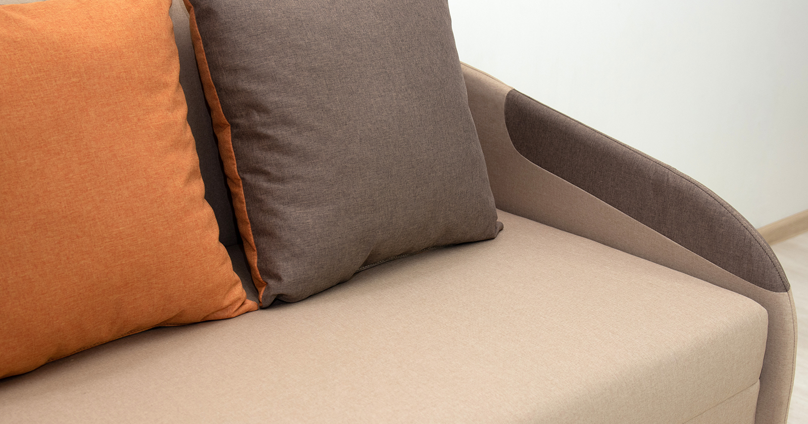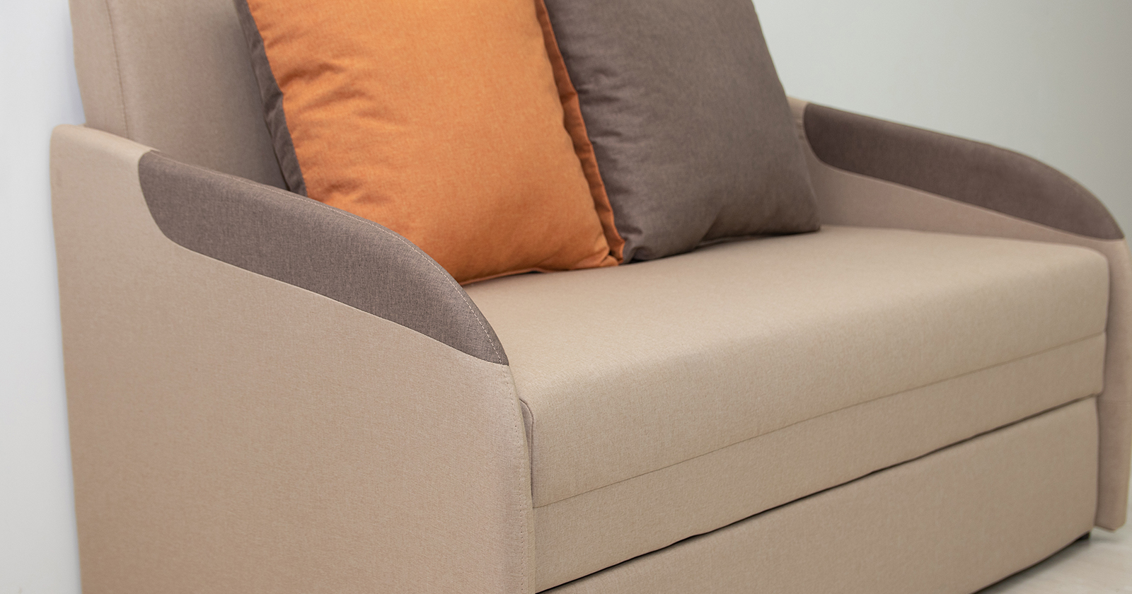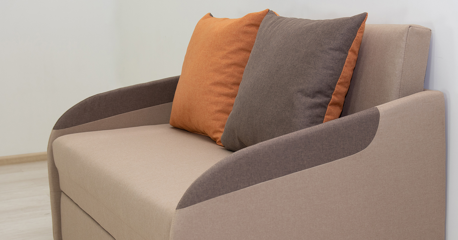 Тканевые вставки на подлокотниках. Две двусторонние приспинные подушки в контрастной ткани. Отделочная строчка по шву стачивания деталей подлокотника.