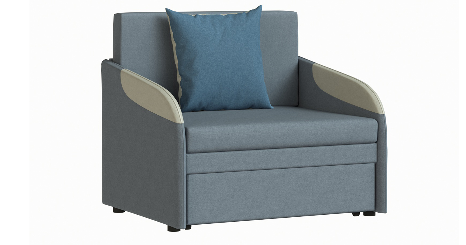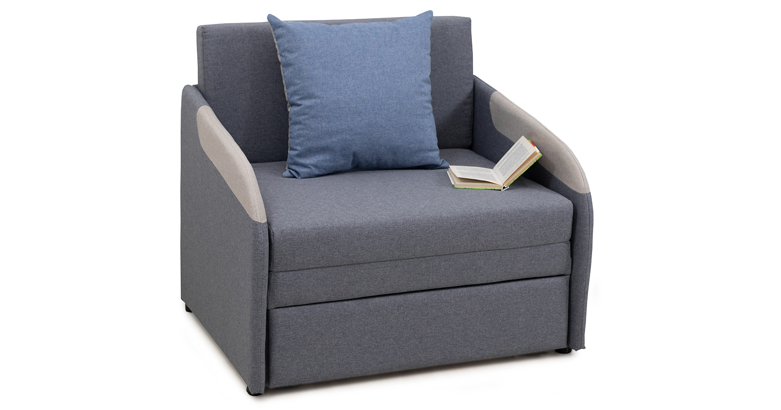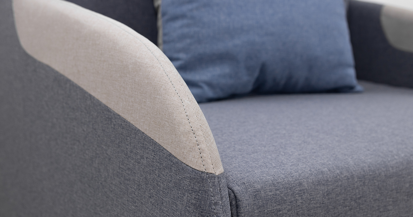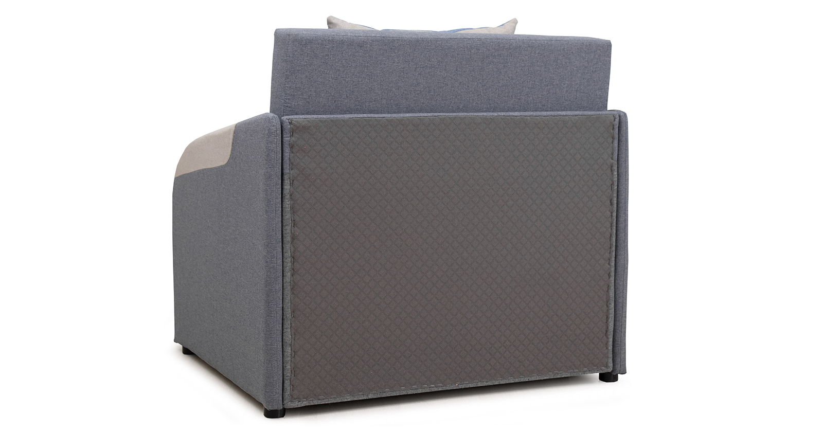 Тканевые вставки на подлокотниках. Одна двусторонняя приспинная подушка в контрастной ткани. Отделочная строчка по шву стачивания деталей подлокотника.