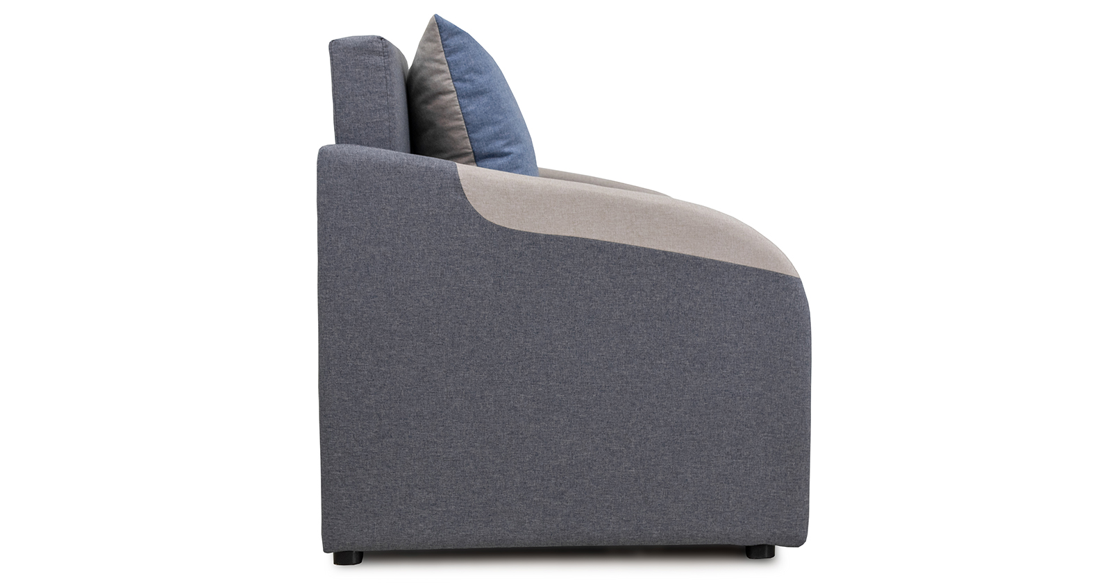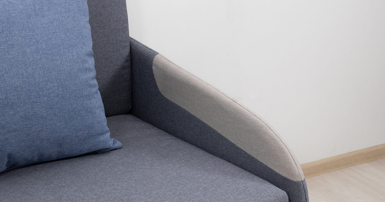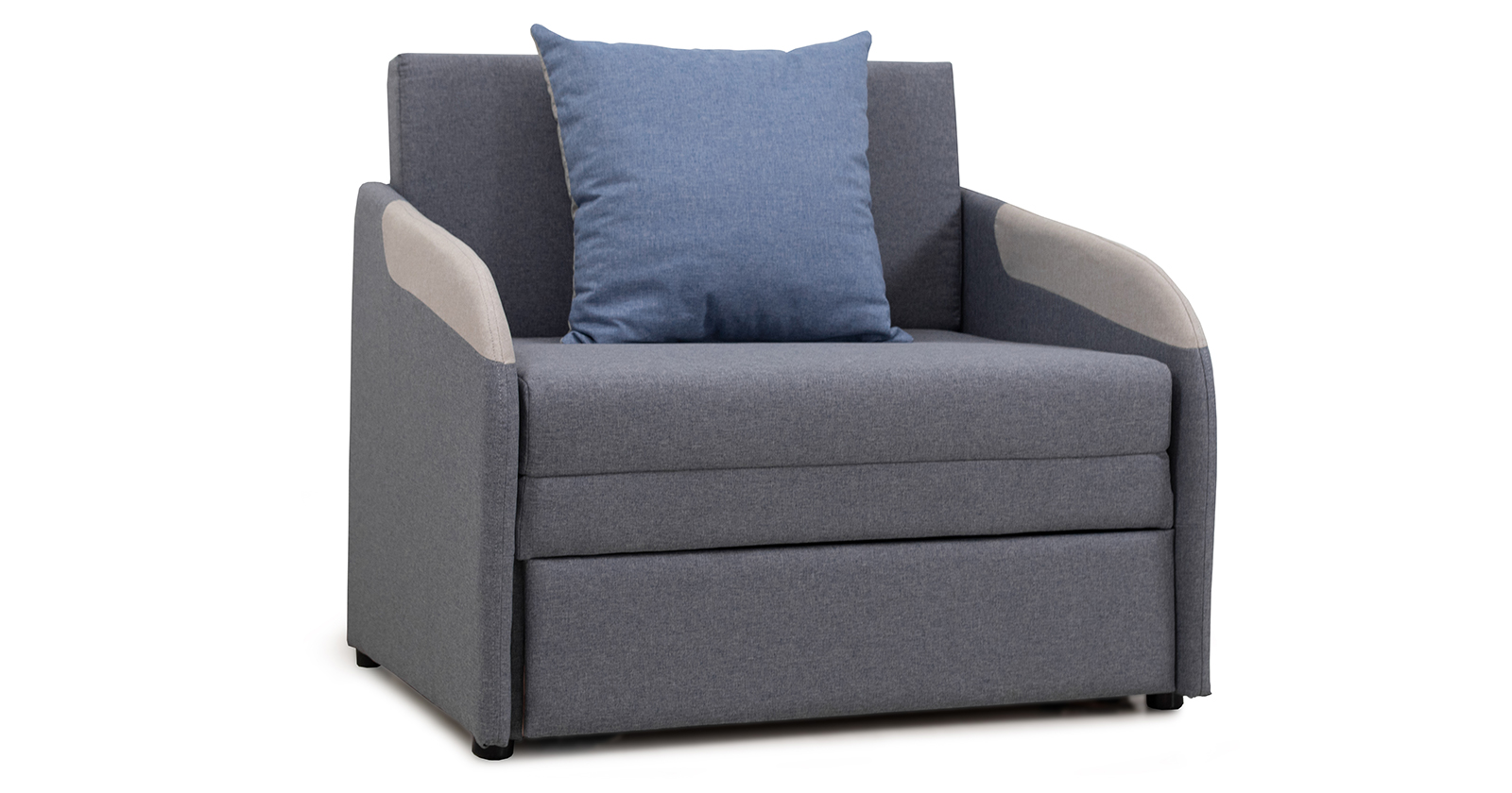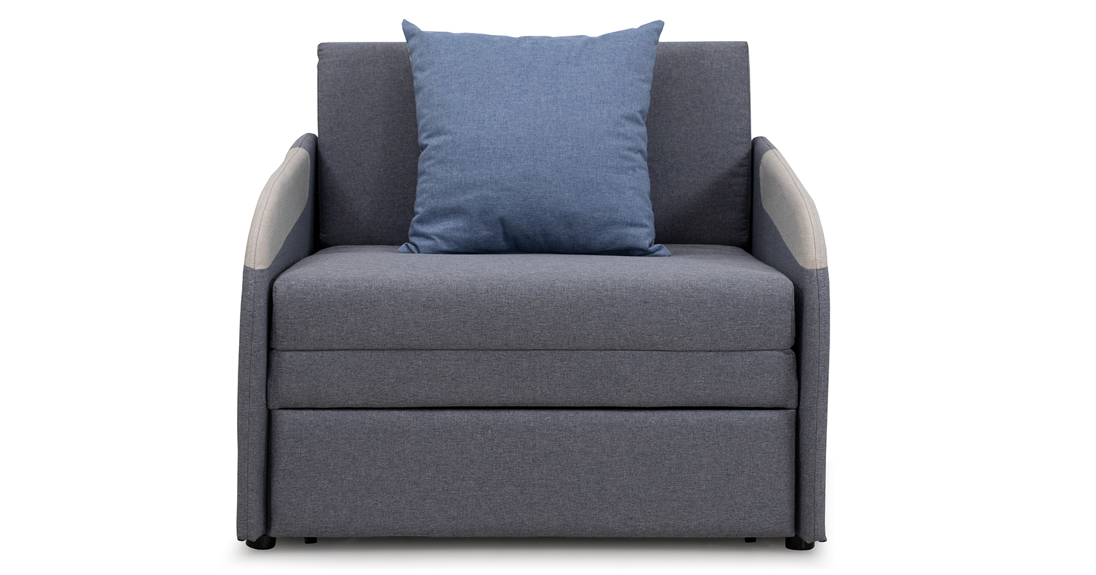 Тканевые вставки на подлокотниках. Одна двусторонняя приспинная подушка в контрастной ткани. Отделочная строчка по шву стачивания деталей подлокотника.