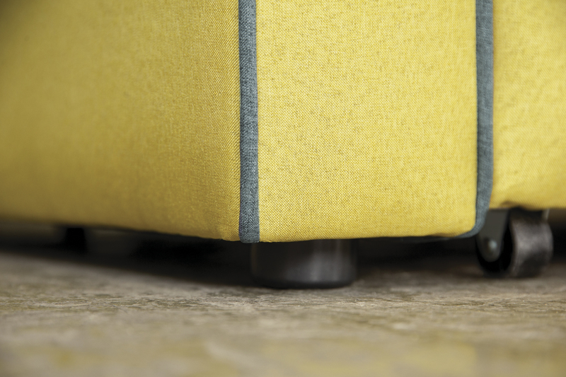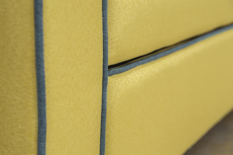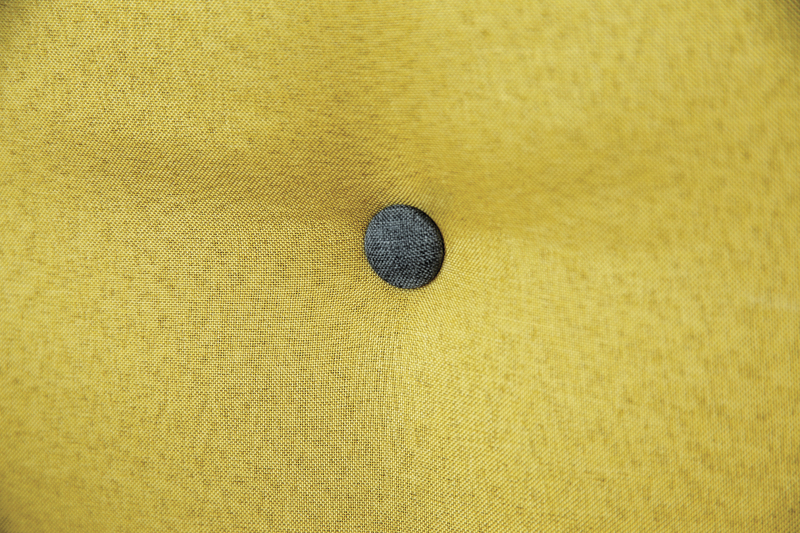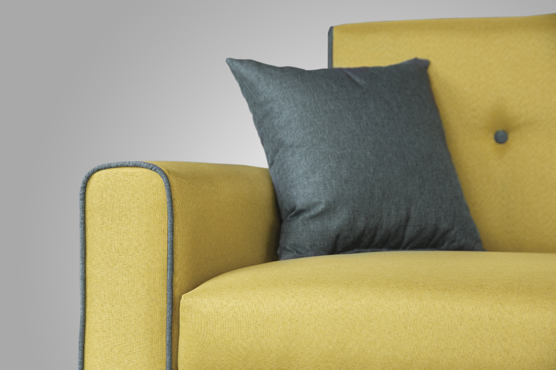 Декоративный контрастный кант по торцу спинки, торцу подлокотника, по верхнему срезу царги. Утяжки с пуговицами на спинке дивана. Две декоративные подушки в контрастной ткани.
