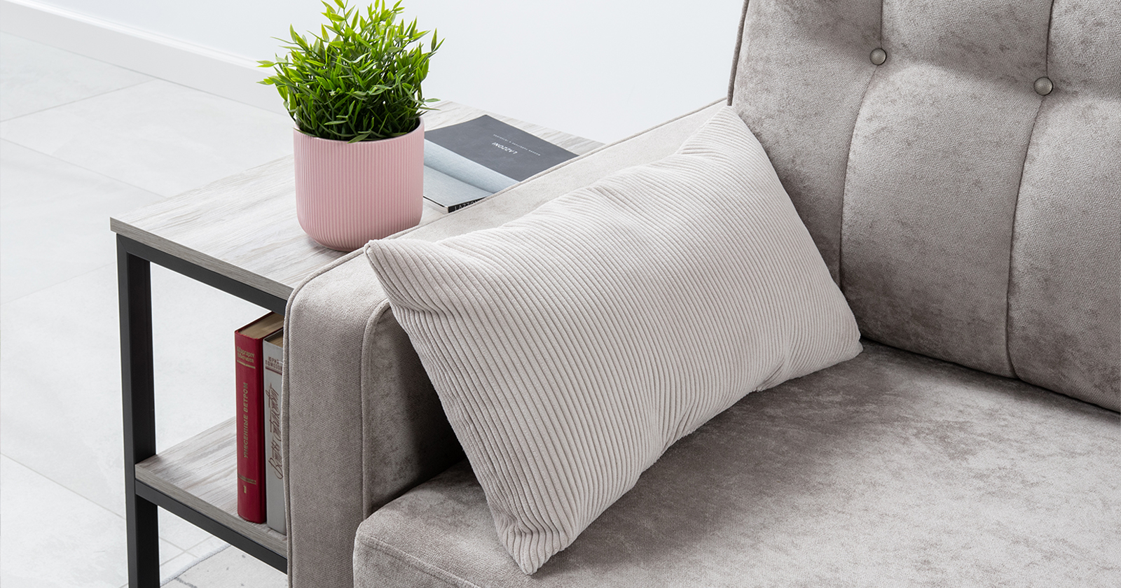 Диван-кровать угловой Арно ТД 567 велюр Лаки 17 пепел розы, Vertical 910 молочно-серый, сборка на любую сторону