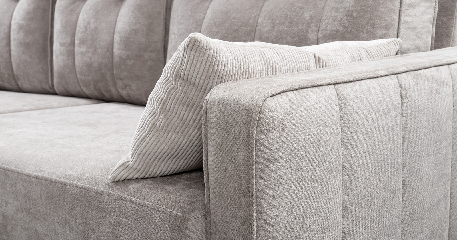 Диван-кровать угловой Арно ТД 565 велюр Лаки 04 песочный, Vertical 910 молочно-серый, сборка на любую сторону