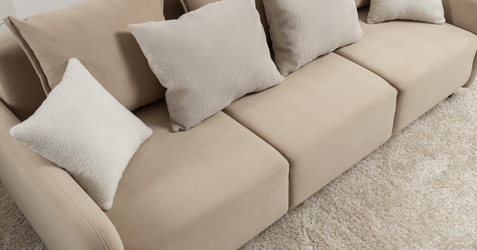 В комплекте 5 двусторонних приспинных подушки и 2 декоративные думки. Задняя спинка в ткани основы. Декоративные отделочные строчки по боковинам и сиденью
