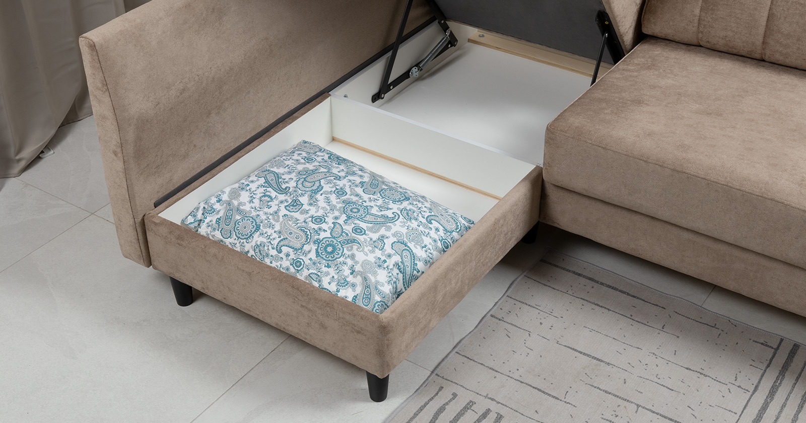 в оттоманке, с перегородкой по центру, размер одного отделения Д 71 х Г 67,5 х В 15 см