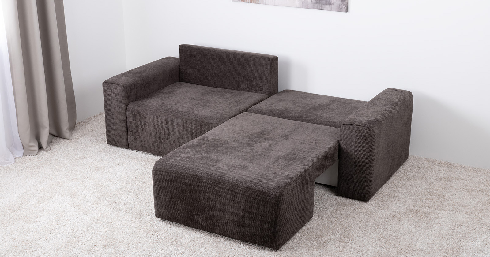 «Компоновка 1» арт. 711 состоит из: оттоманки арт. ТО 711, дивана арт. ТД 711, широкого подлокотника арт. ТБ 711, широкого подлокотника с ящиком арт. ТБ 711, двух приспинных подушек арт. 711 и двух декоративных подушек арт. 711.