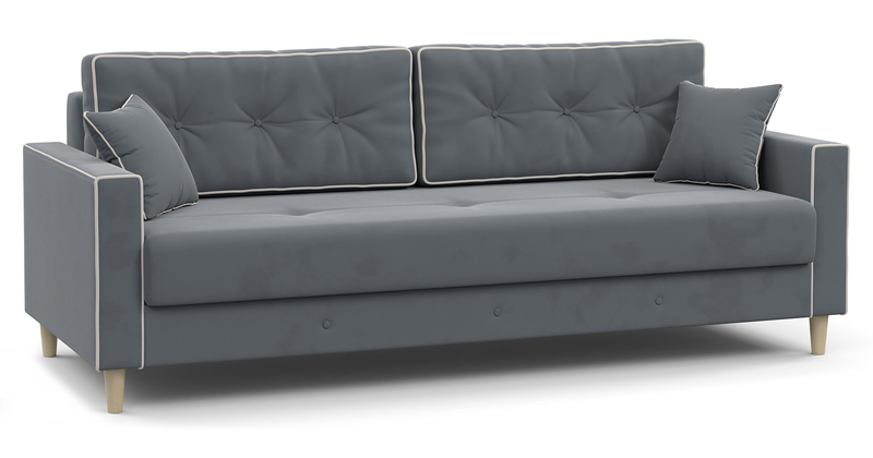 Утяжки с пуговицами на приспинных подушках и царге дивана. Контрастный декоративный кант разной толщины на подлокотниках, приспинных и декоративных подушках. Утяжки на сиденье дивана.