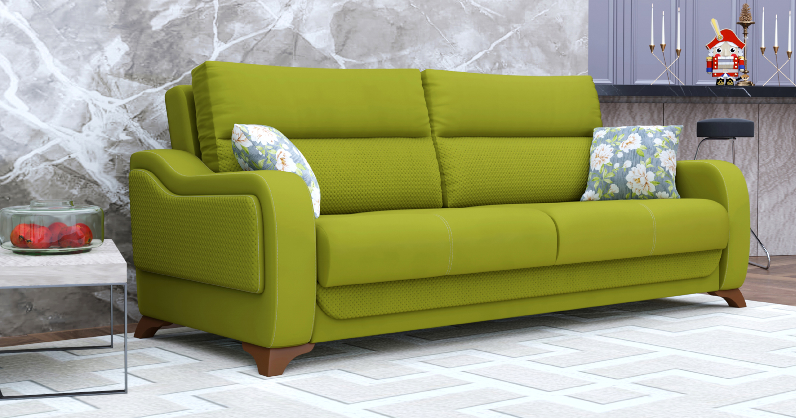 Диван прямой Фрея ТД 194 велюр яблочный, белые пионы