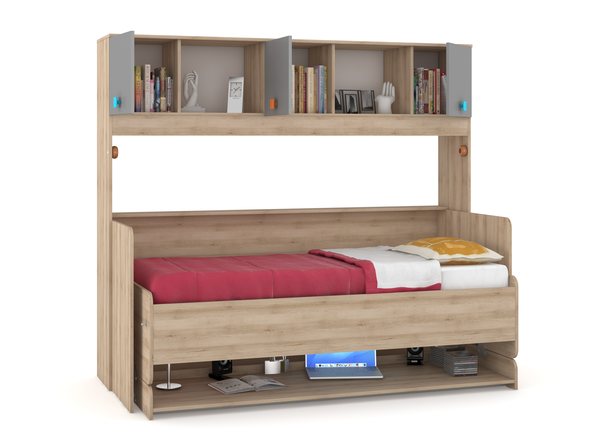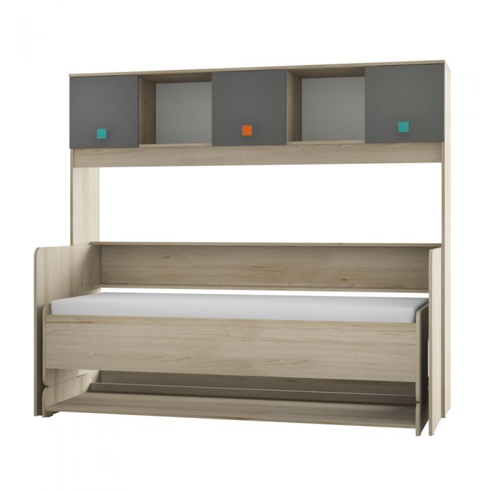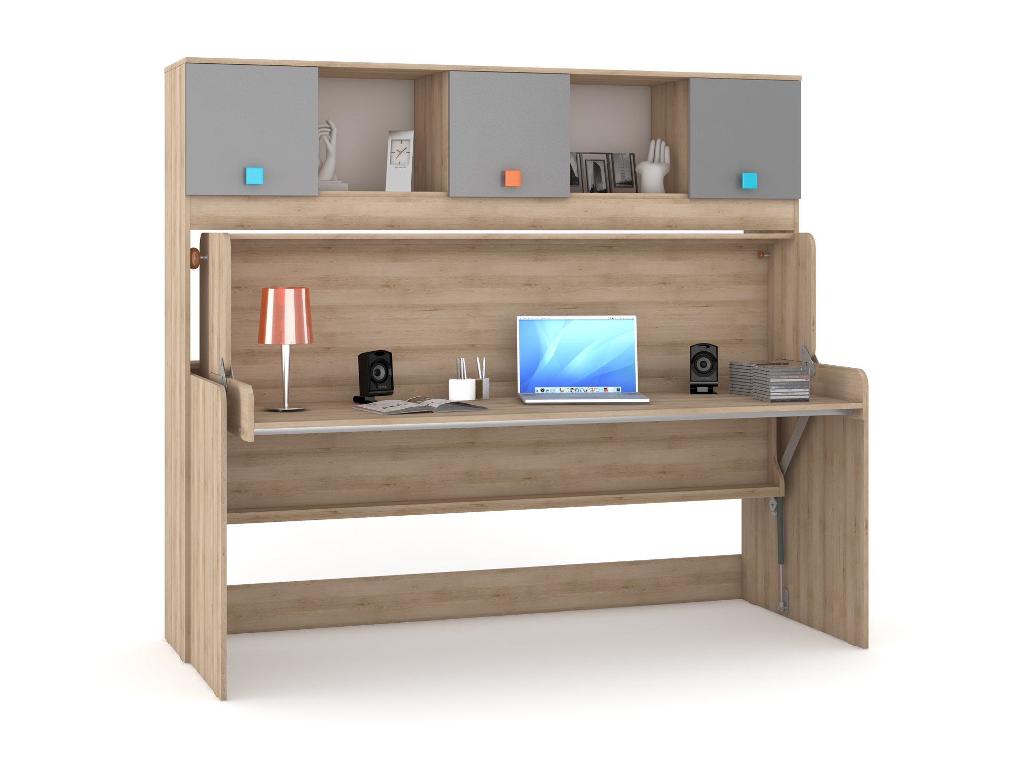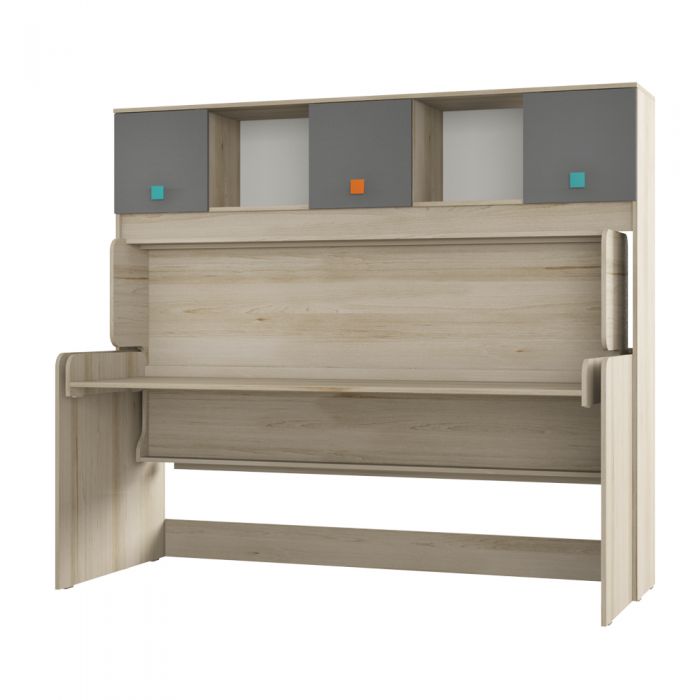 Уникальная кровать-трансформер, имеющая два рабочих положения – «Стол» и «Кровать» поможет сэкономить драгоценные квадратные метры, оставляя достаточно простора для движения. Высота от столешницы до основания кровати (если кровать разложена) составляет 375 мм, что позволяет оставить на столе лампу, ноутбук, книги и тетради.