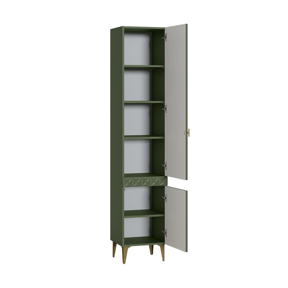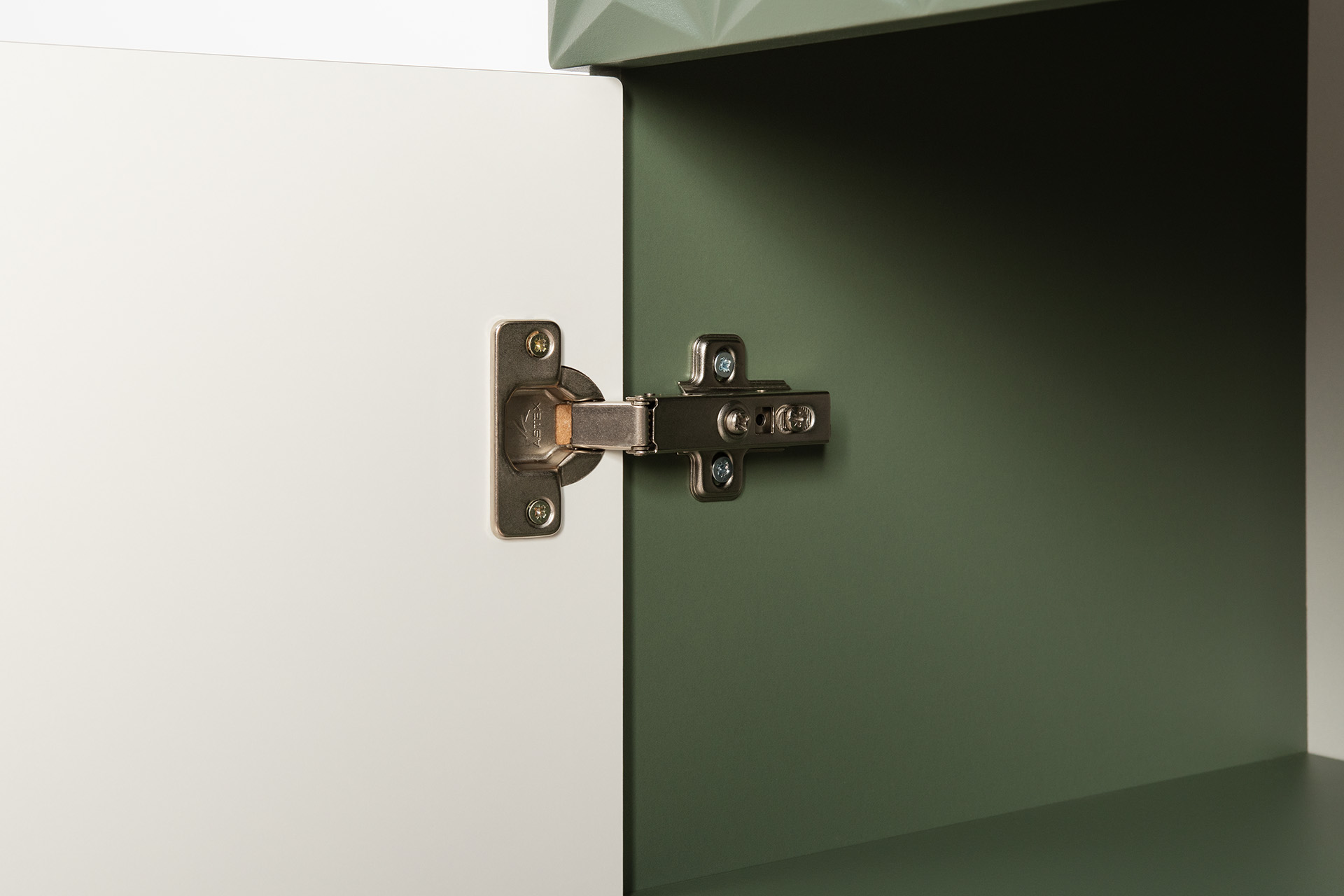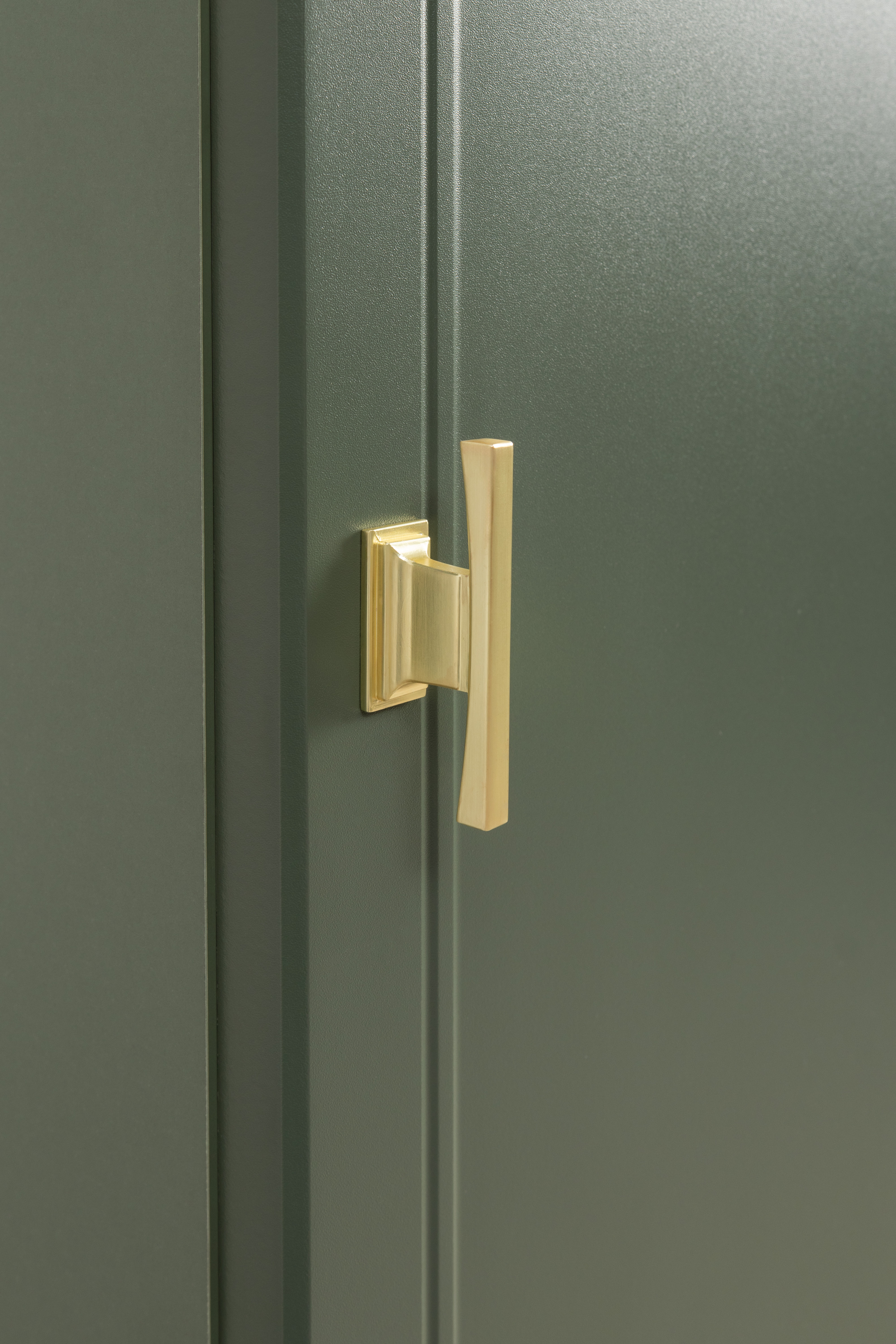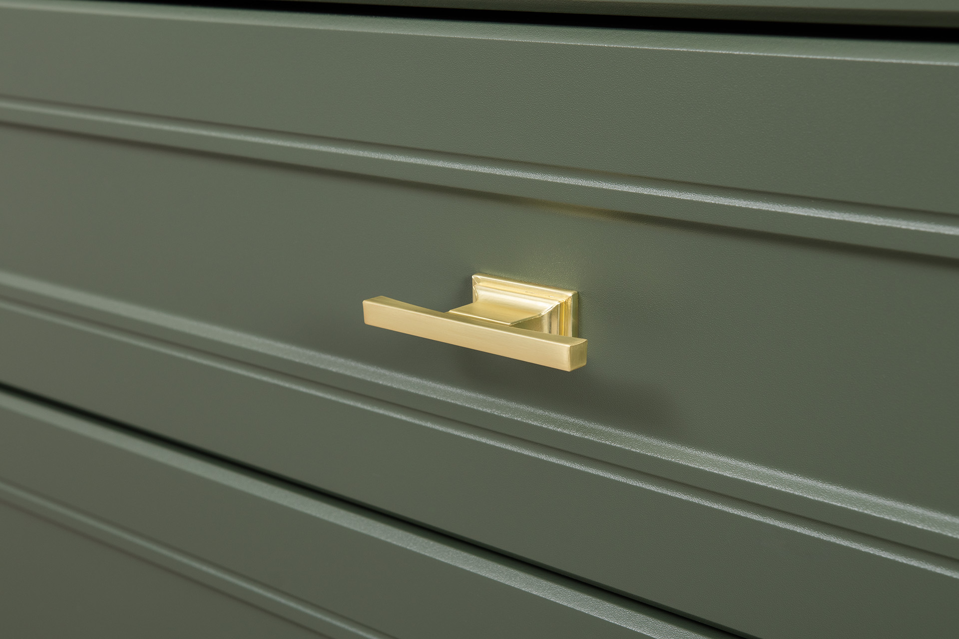 Изящные линии, глубокая фрезеровка фасадов из МДФ и благородные оттенки. Утончённая «Слоновая кость» и изысканная «Олива Шагрень» с глубоким зелёным тоном — создают атмосферу уюта, тепла и благородства. Металлические ручки и опоры золотого цвета придают мебели утончённый блеск, а петли и направляющие с доводчиками обеспечивают плавное и бесшумное закрытие фасадов.