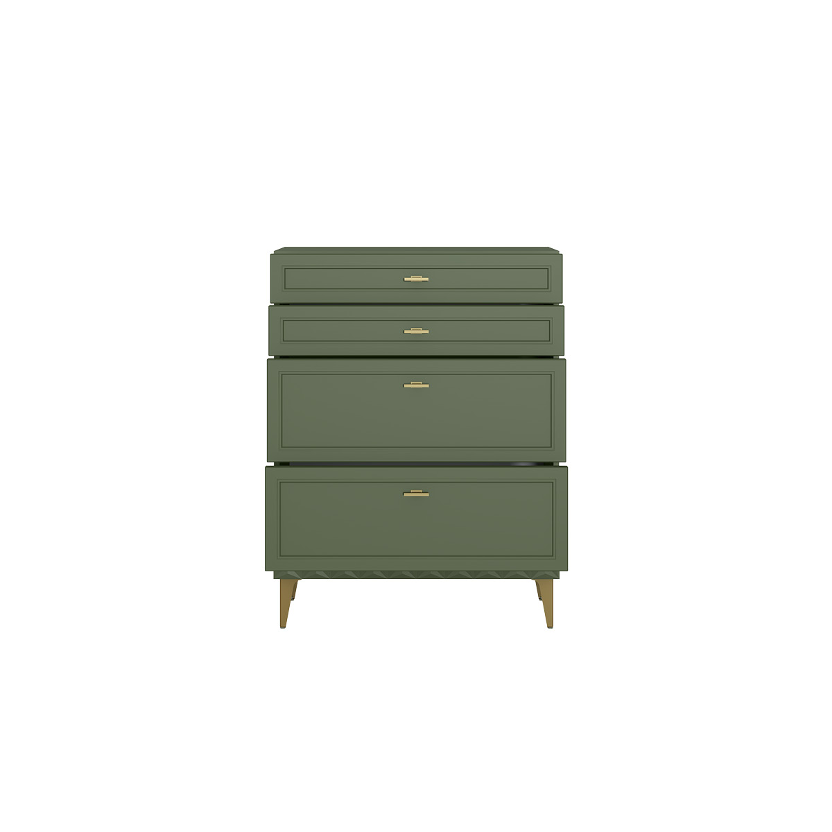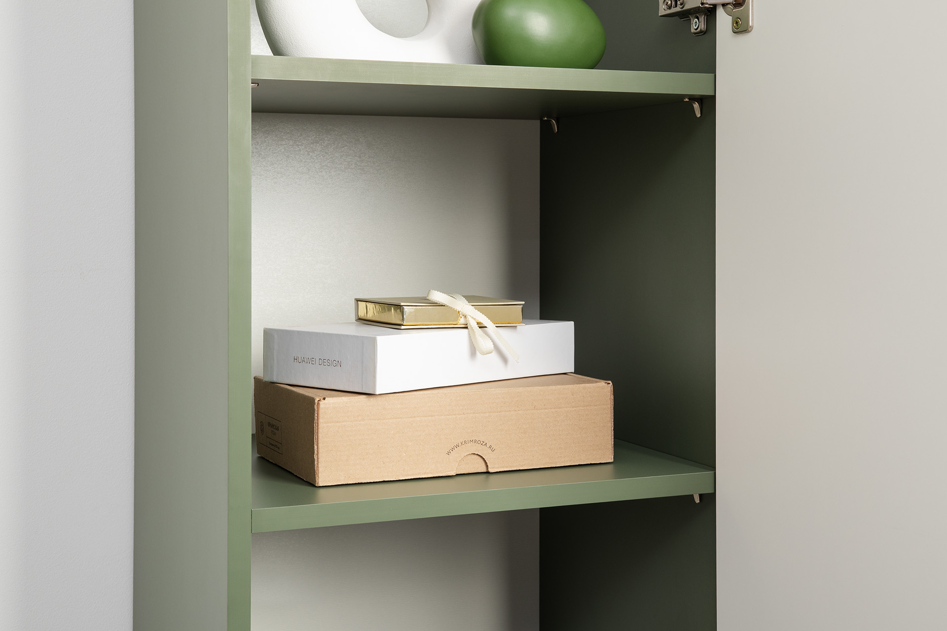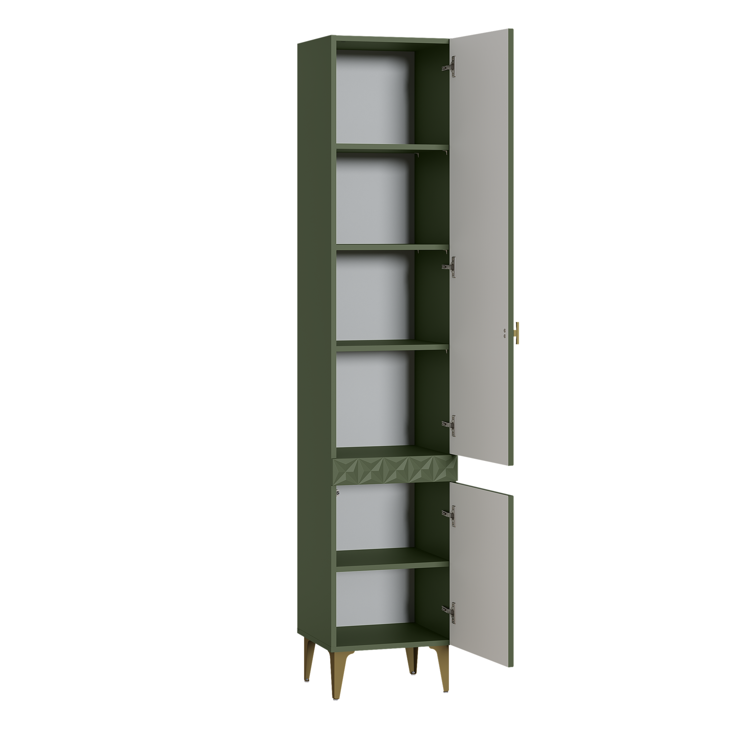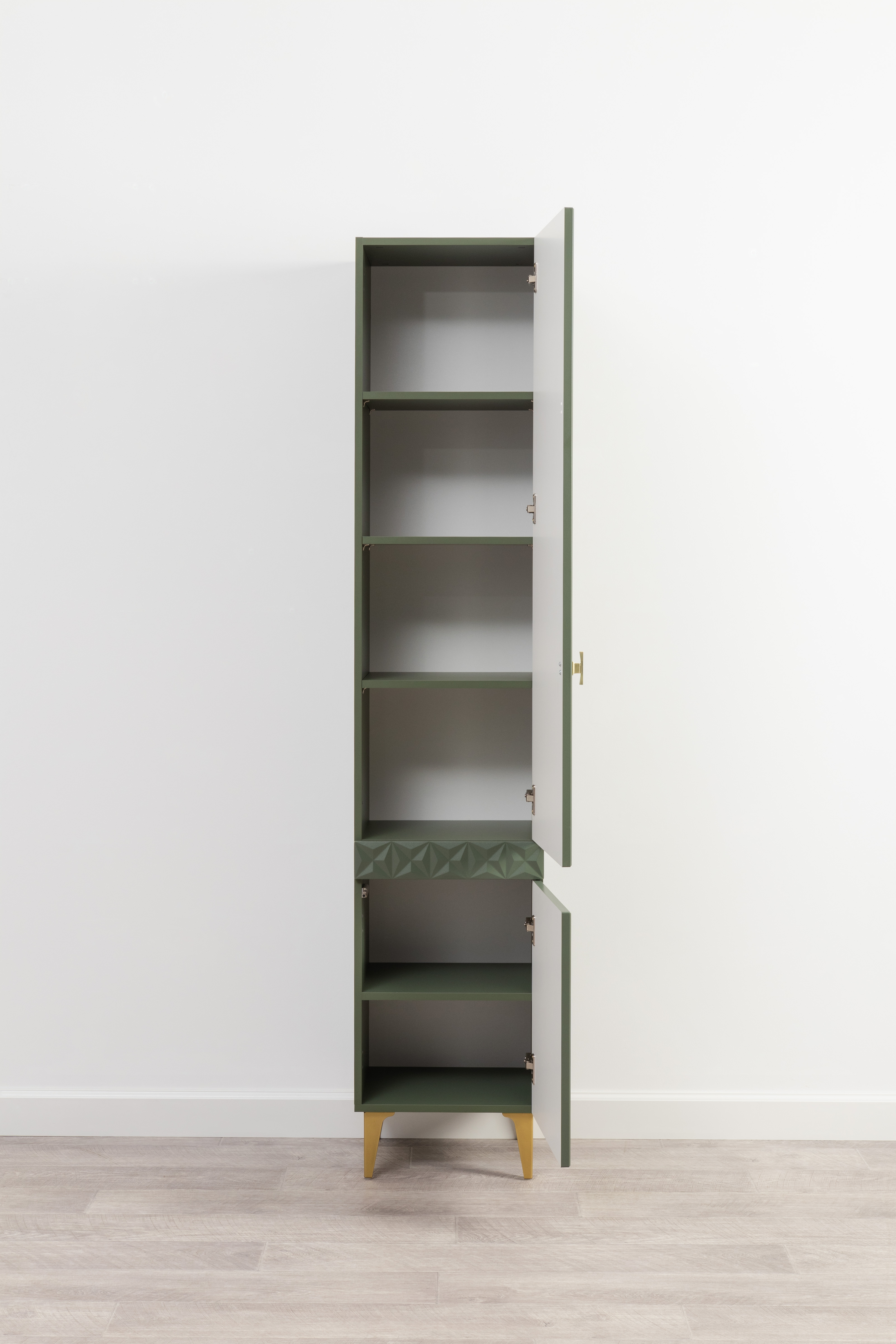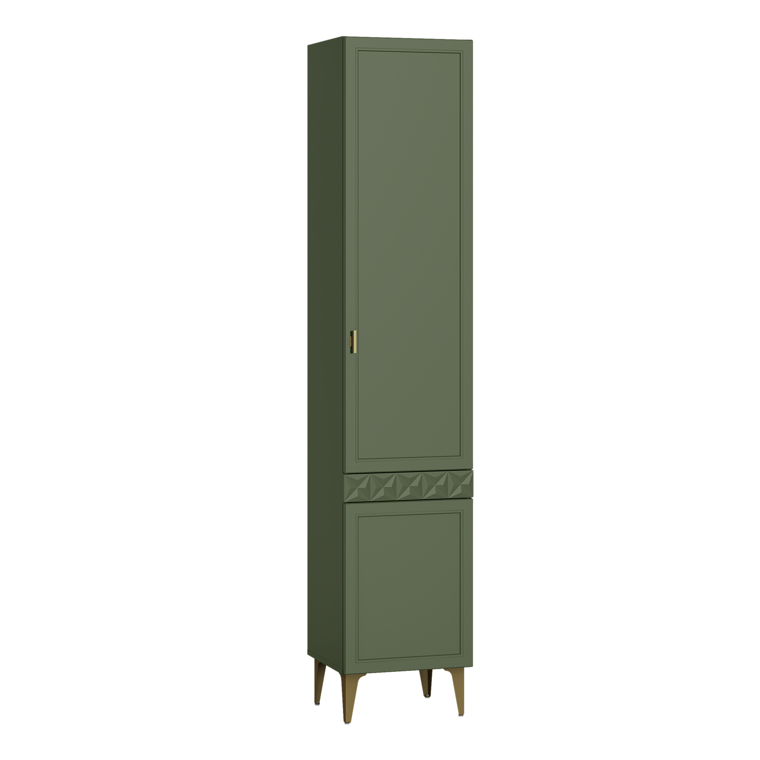 Изящные линии, глубокая фрезеровка фасадов из МДФ и благородные оттенки. Утончённая «Слоновая кость» и изысканная «Олива Шагрень» с глубоким зелёным тоном — создают атмосферу уюта, тепла и благородства. Металлические ручки и опоры золотого цвета придают мебели утончённый блеск, а петли и направляющие с доводчиками обеспечивают плавное и бесшумное закрытие фасадов.