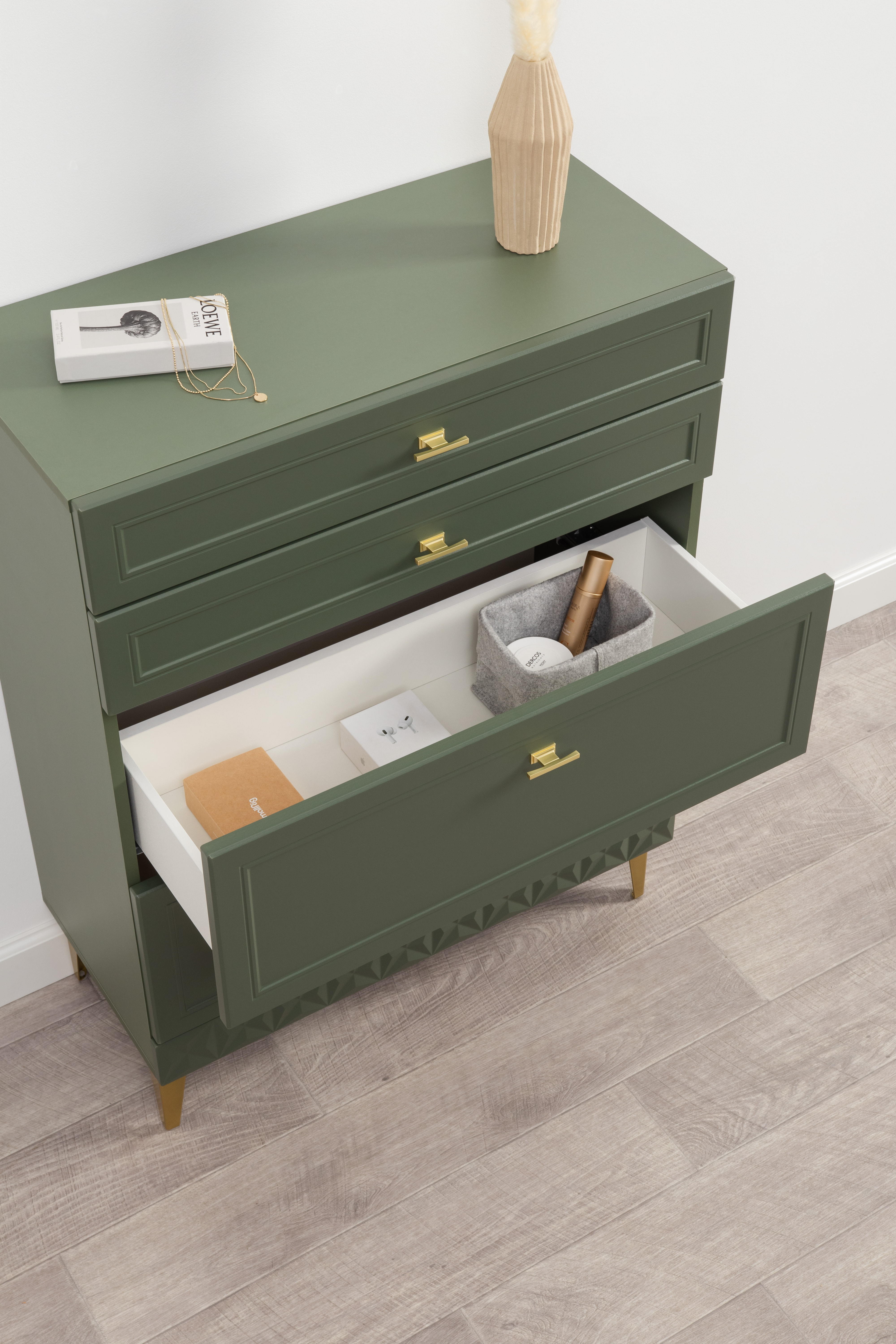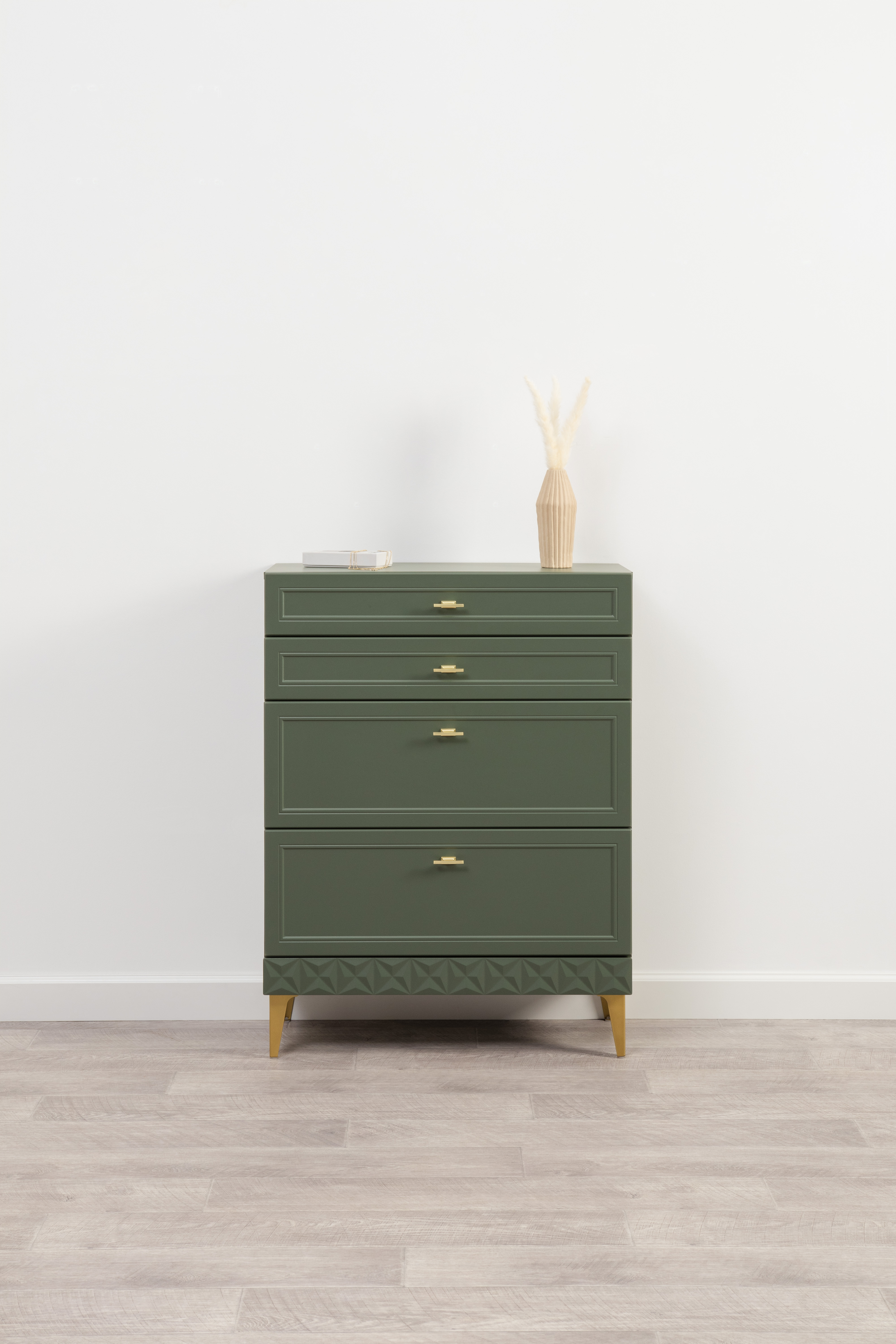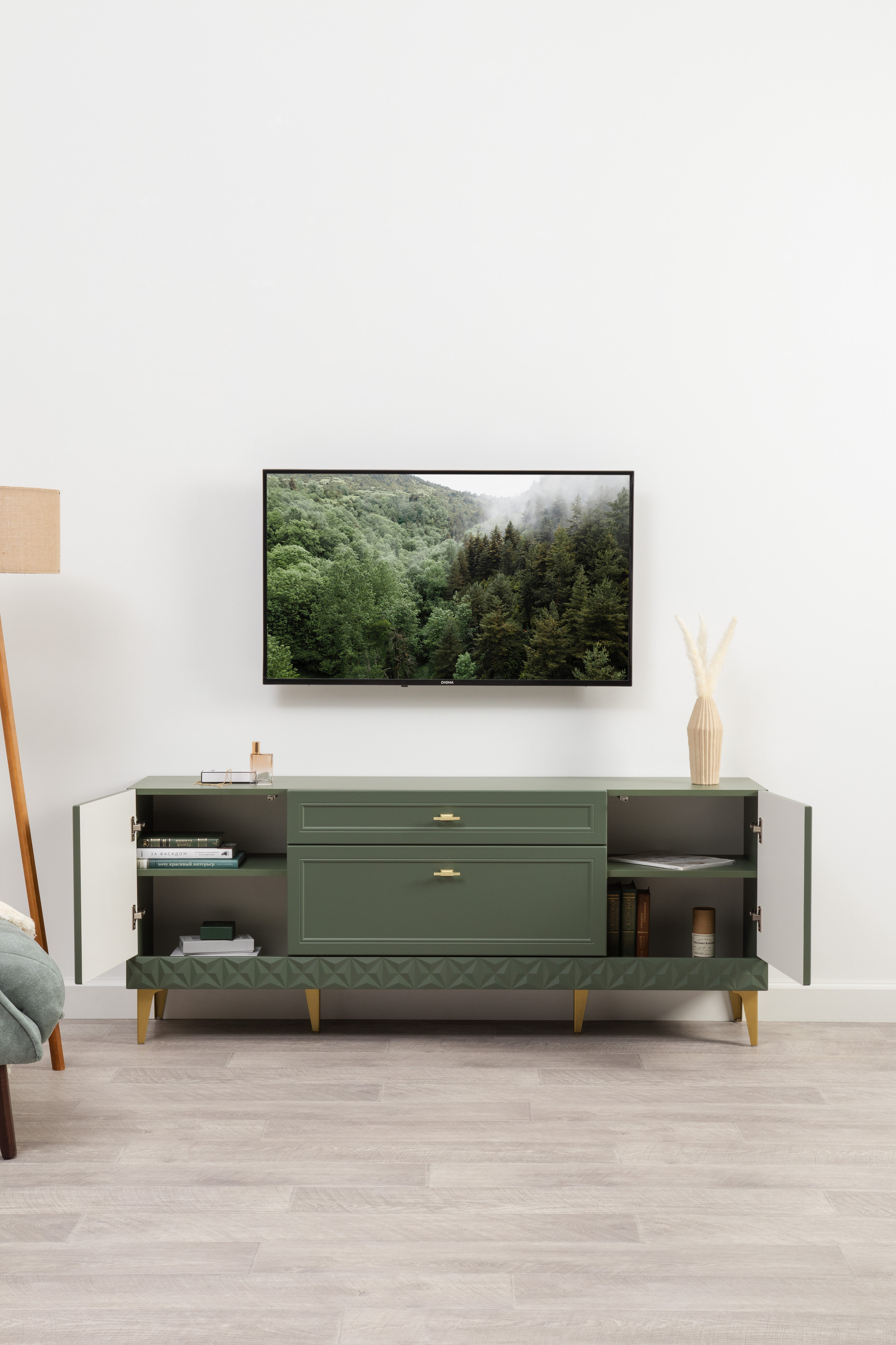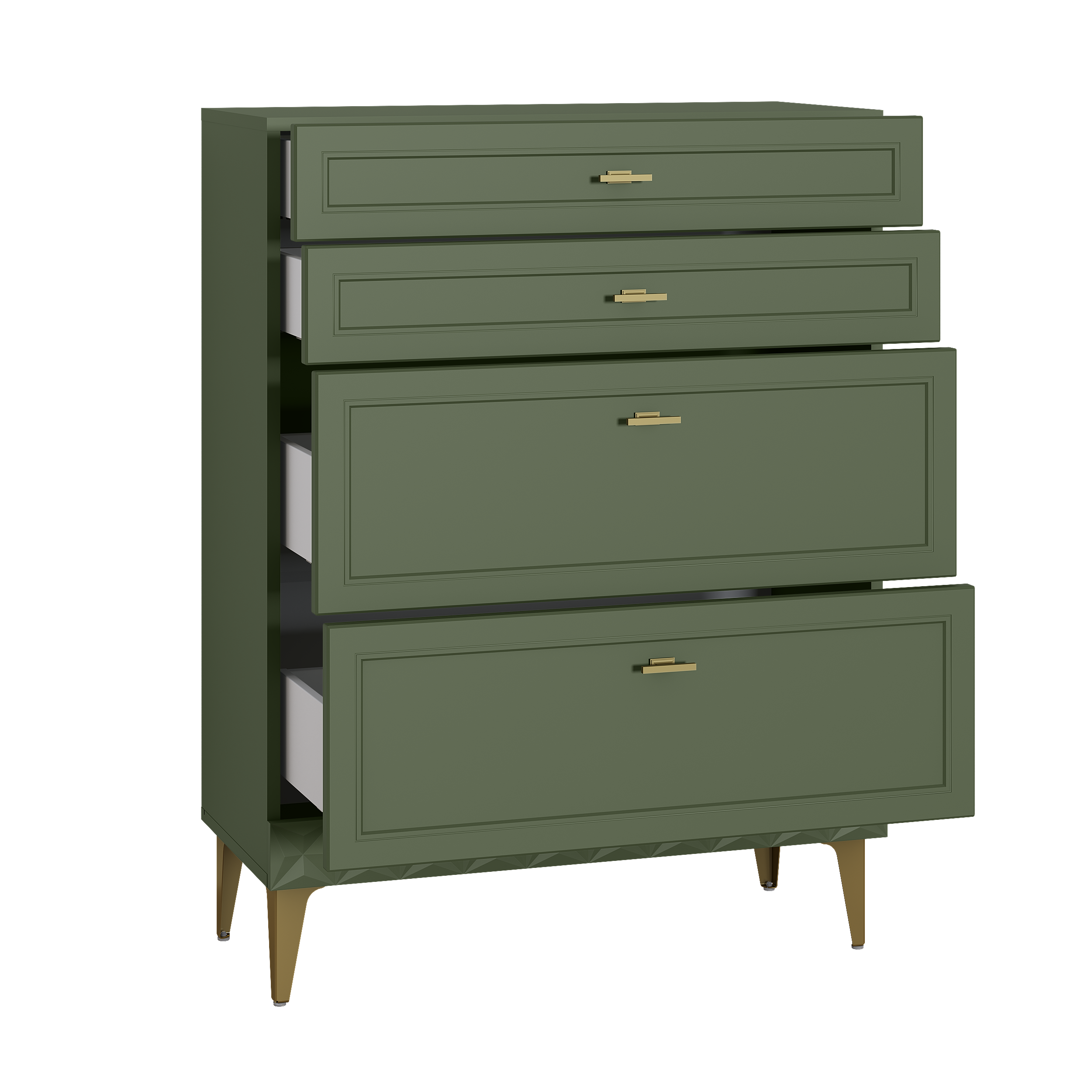 Изящные линии, глубокая фрезеровка фасадов из МДФ и благородные оттенки. Утончённая «Слоновая кость» и изысканная «Олива Шагрень» с глубоким зелёным тоном — создают атмосферу уюта, тепла и благородства. Металлические ручки и опоры золотого цвета придают мебели утончённый блеск, а петли и направляющие с доводчиками обеспечивают плавное и бесшумное закрытие фасадов.