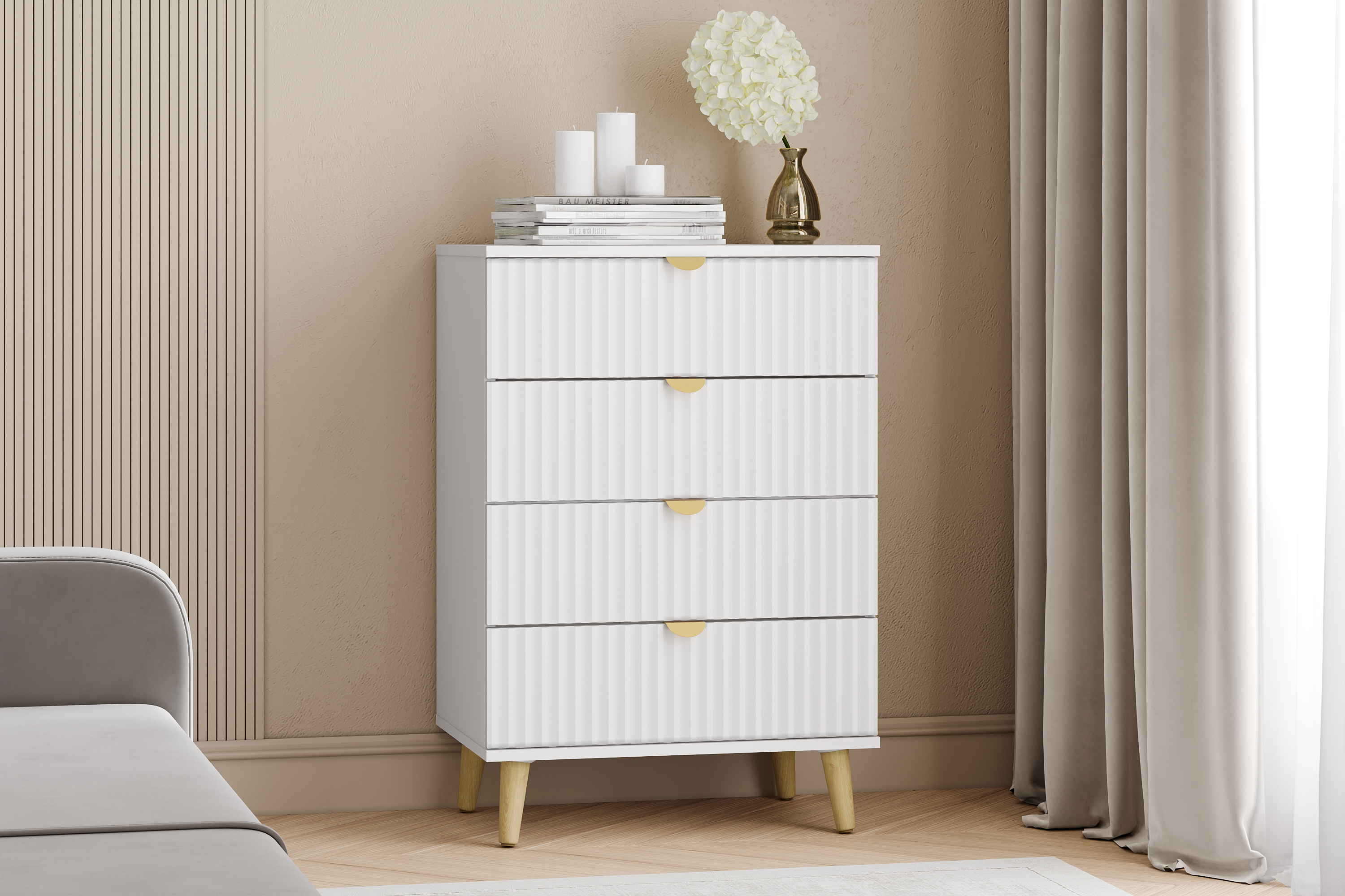 Комод оснащен четырьмя выдвижными ящиками, которые открываются плавно и бесшумно благодаря шариковым направляющим, а высокие опоры облегчают процесс уборки.