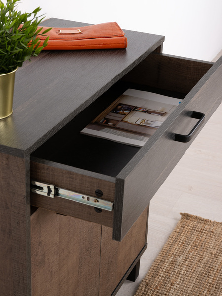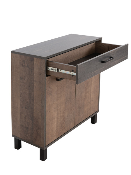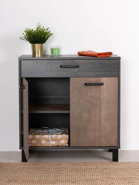 Комод в стиле лофт 13.310.02 идеален для хранения. Его можно использовать как: комод в прихожую, гостиную, спальню, детский комод для игрушек и вещей. За двумя распашными дверцами скрывается широкая полка. Разместите на ней всё, что захотите: постельное белье, посуду, книги. Для мелочей у комода предусмотрен выдвижной ящик. Деревянный комод на регулируемых ножках высотой 10 см можно установить так, чтобы скомпенсировать неровности пола. Чёрные матовые металлические ручки гармонируют с текстурой и расцветкой под тёмный колониальный дуб. Оцените, как комод для вещей сочетается со стеллажом (Стронг 13.346), полкой (Стронг 15.65), тумбами (Стронг 13.242, Стронг 13.243, Стронг 13.263, Стронг 13.268) и комодом (Стронг 13.310.01) из линейки Стронг. Соберите комплект мебели в едином стиле. В комплекте идет подробная инструкция по сборке и весь необходимый крепеж.
