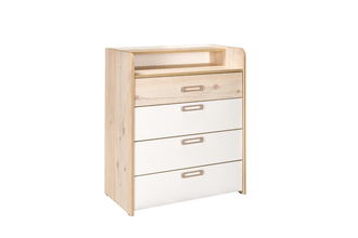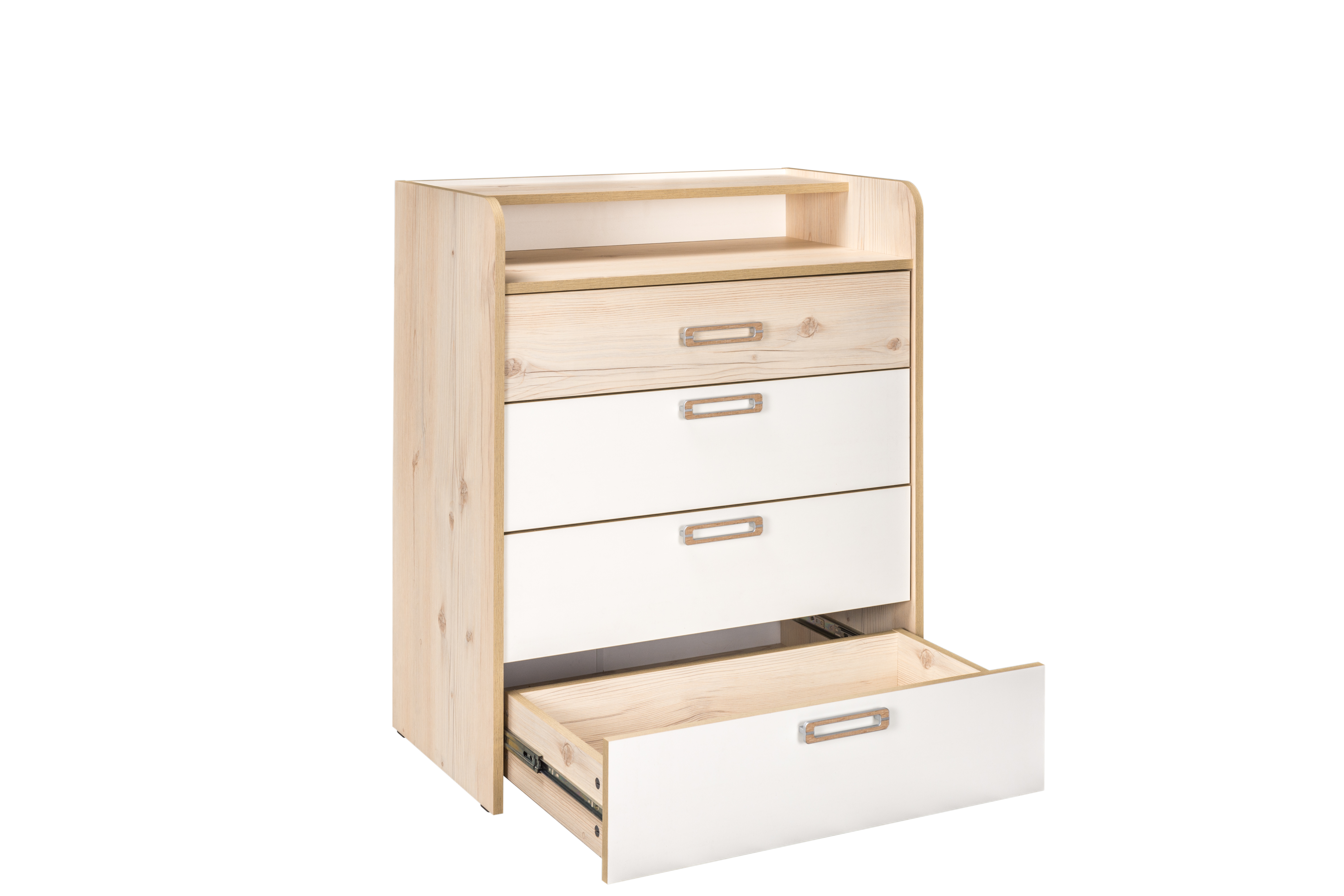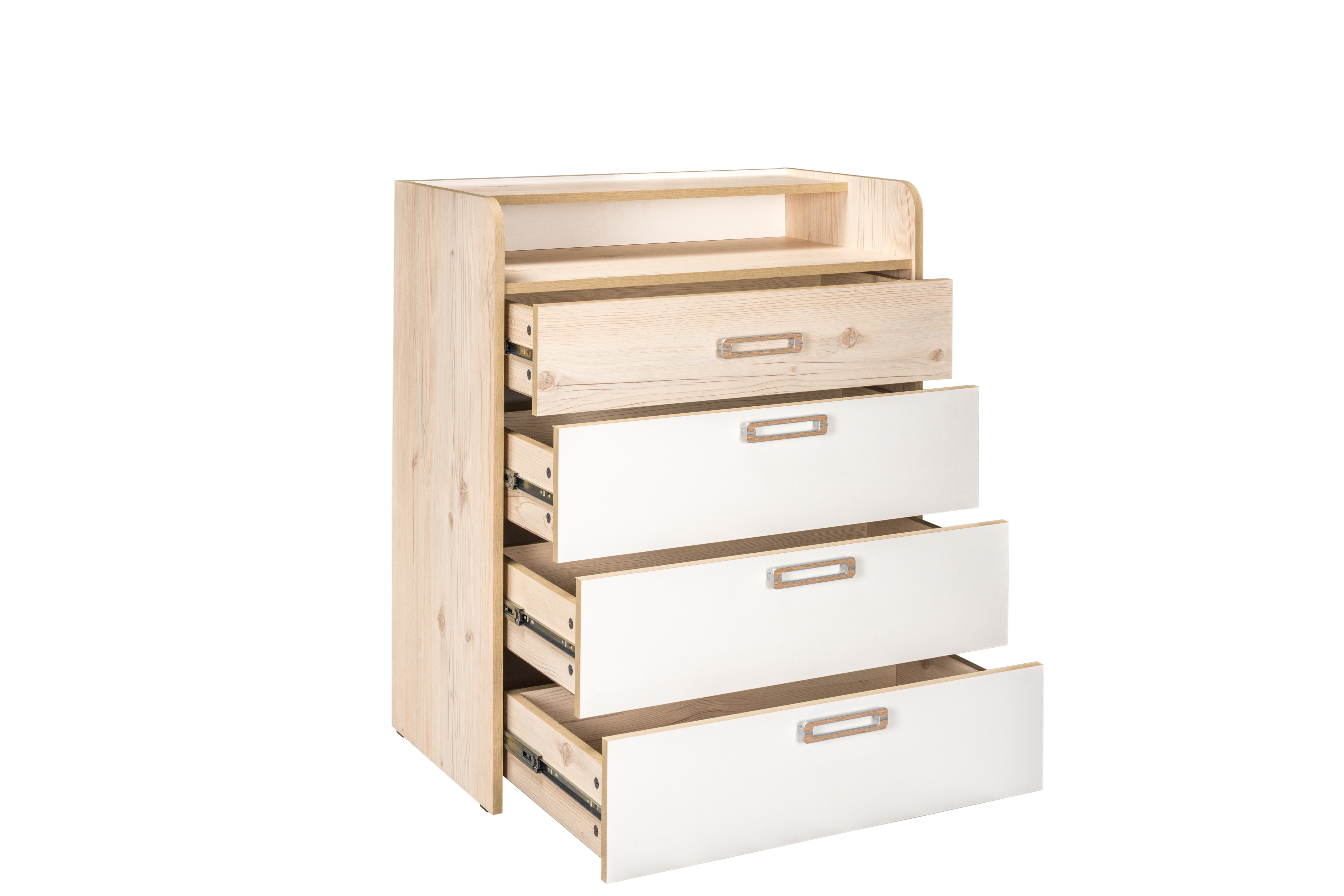 Комод имеет 4 ящика, которые укомплектованы шариковыми направляющими полного выдвижения, что не позволит будить ваших близких в неподходящий момент, ящики закрываются мягко и бесшумно. Функционал комода идеально подойдет для хранения белья.