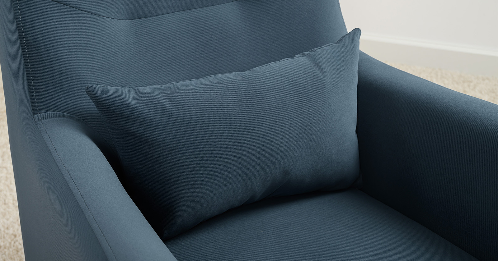 Декоративная утяжка на спинке кресла, декоративная подушка в цвете кресла, металлические опоры переходят в декоративный элемент подлокотника