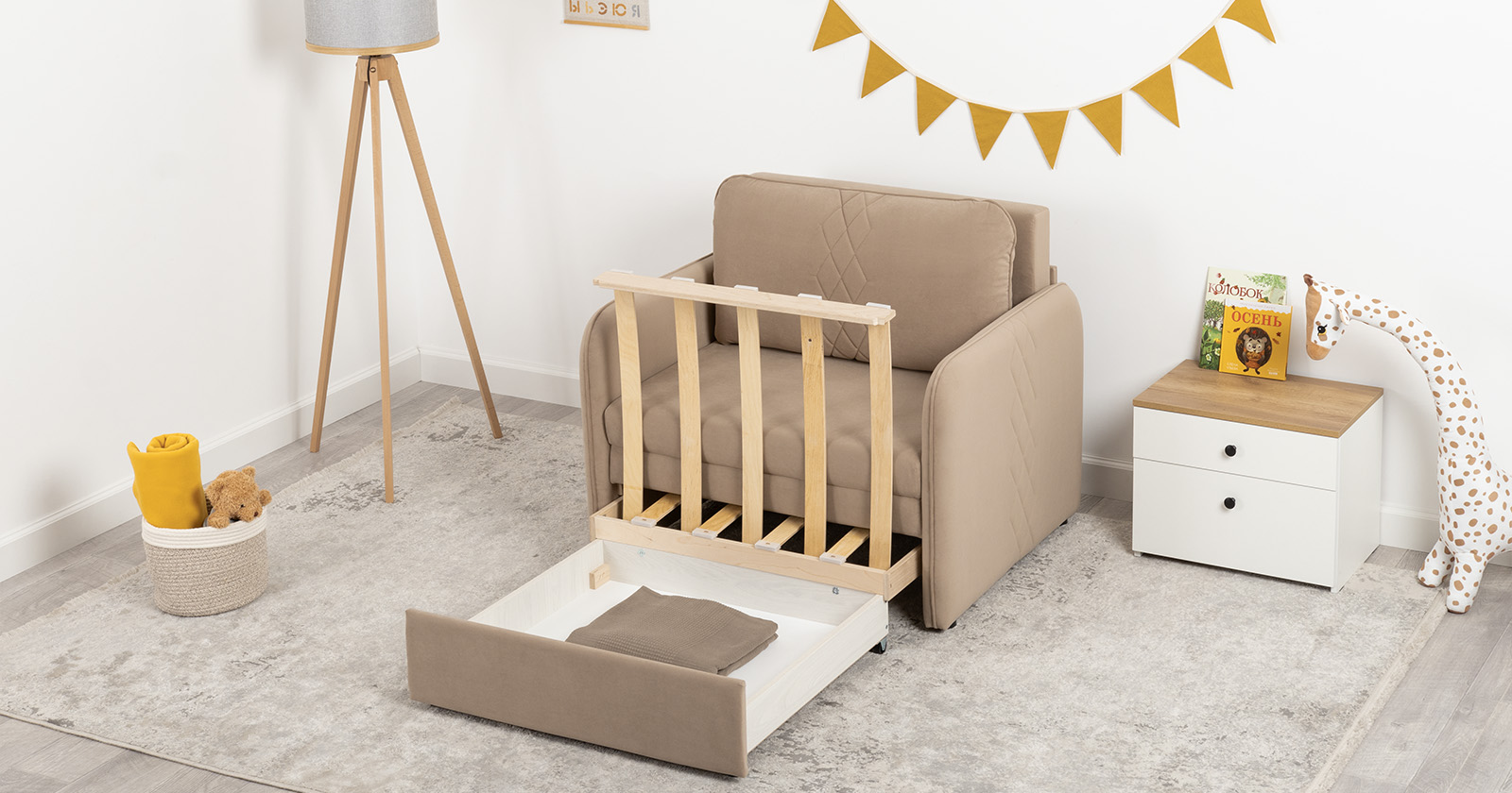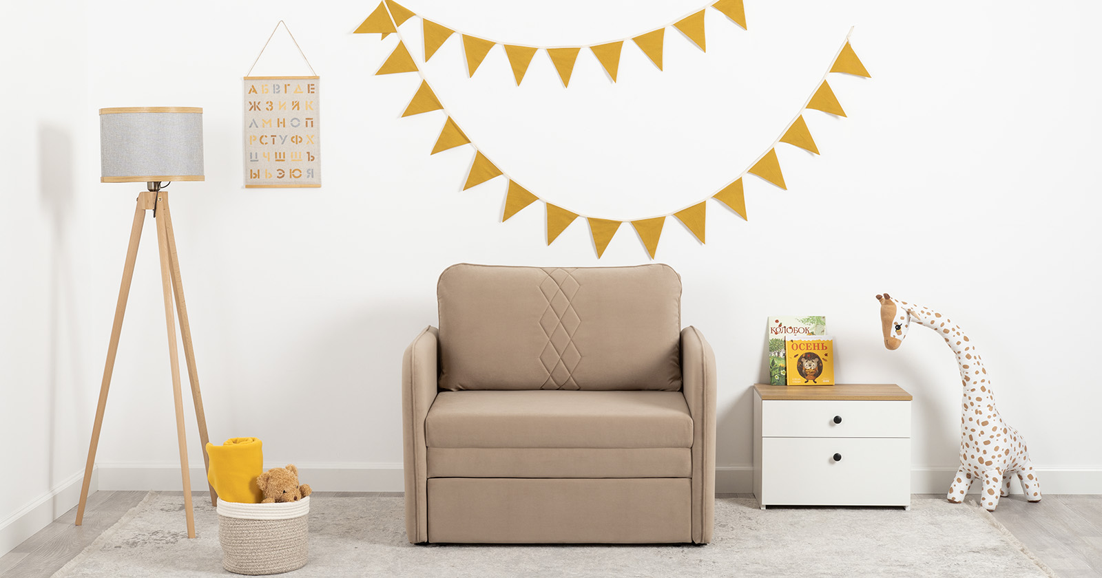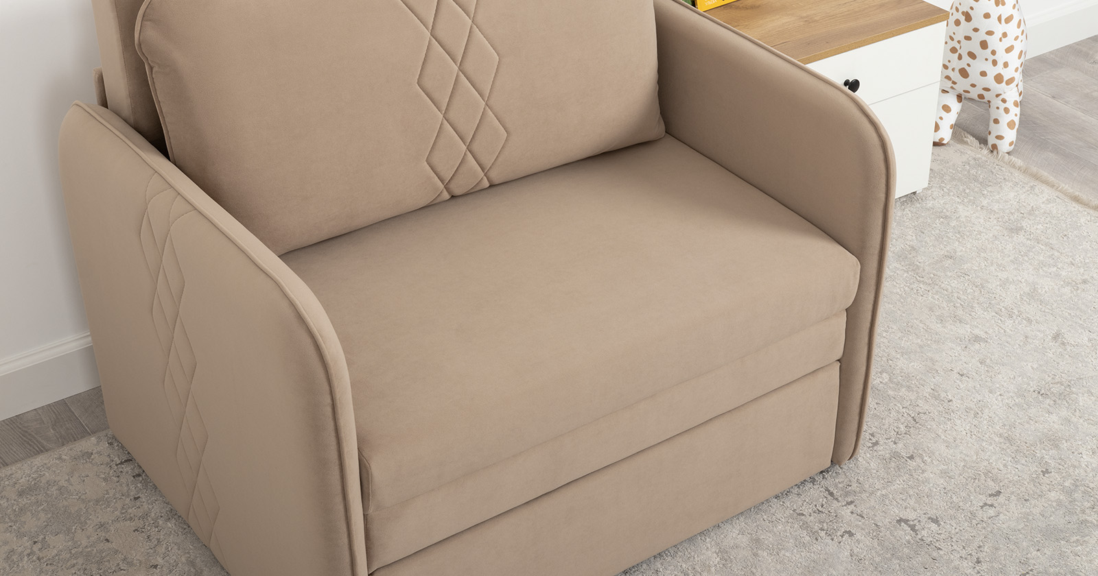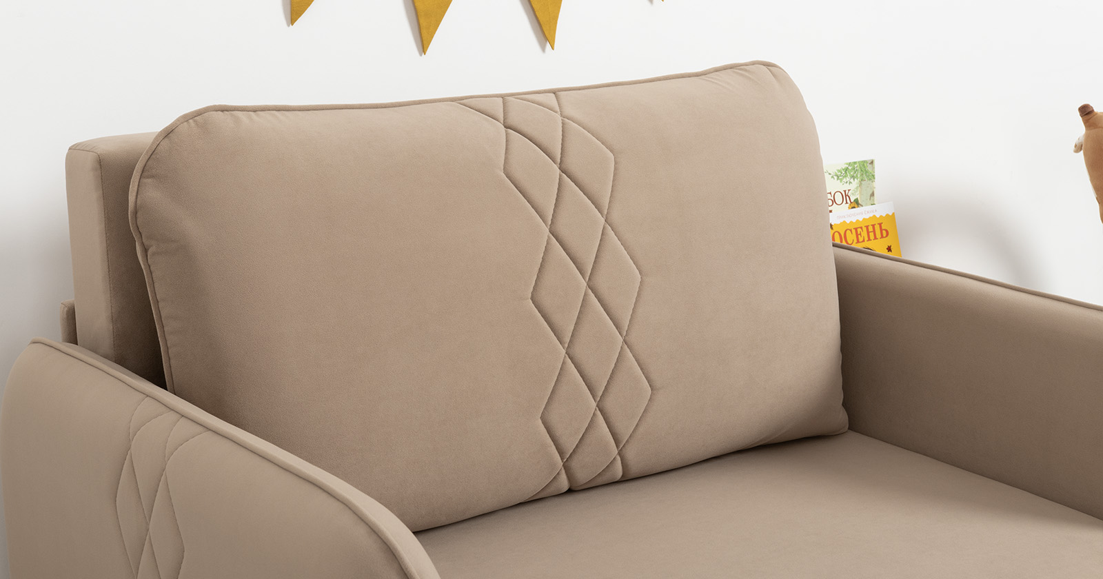 Стильный компактный диван для детской и гостиной. При своих скромных размерах он трансформируется в полноценное спальное место для детей и подростков. Лаконичный дизайн в виде декоративной стежки подчеркивает фактуру велюра, а небольшие размеры позволят разместить его в любом пространстве.