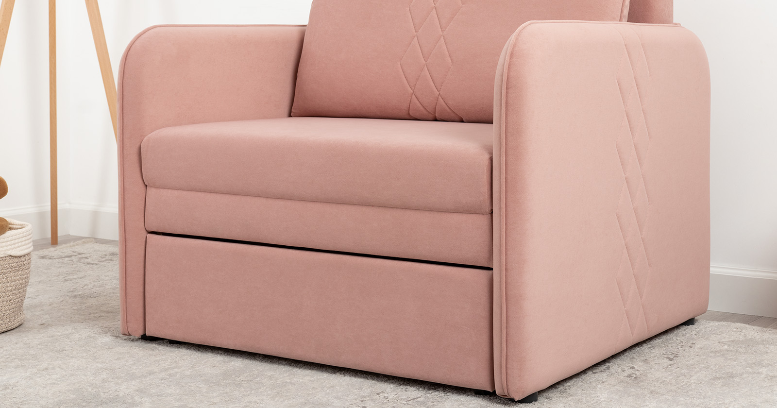Стильный компактный диван для детской и гостиной. При своих скромных размерах он трансформируется в полноценное спальное место для детей и подростков. Лаконичный дизайн в виде декоративной стежки подчеркивает фактуру велюра, а небольшие размеры позволят разместить его в любом пространстве.