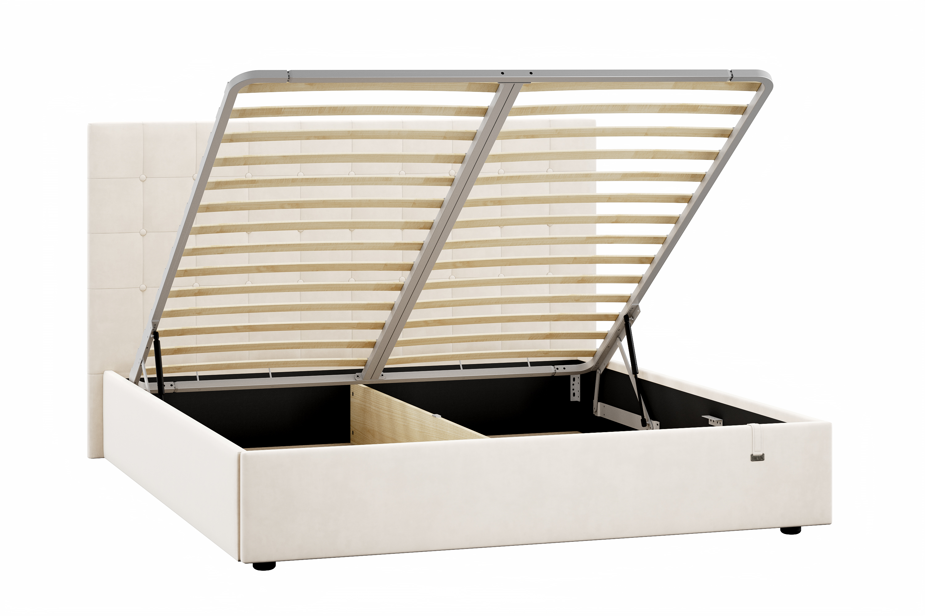 Основание под матрас оборудовано березовыми ламелями. Реечное основание обеспечивает циркуляцию воздуха, что наилучшим образом сказывается на гигиенических свойствах матраса, ведь в нем не будет скапливаться влага, пыль и запахи.