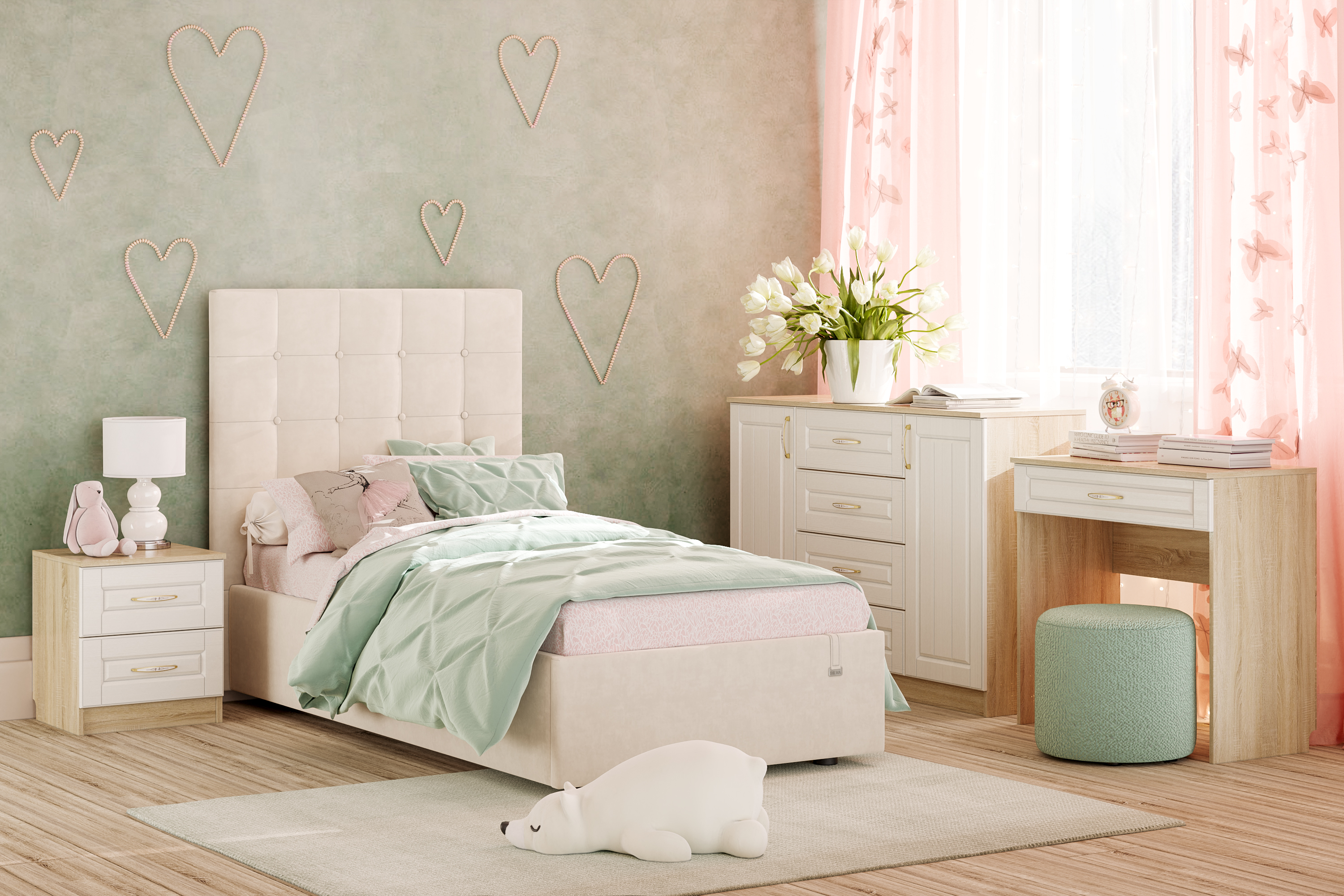 Кровати выполнены в нейтральных и ярких тканях велюр, что позволяет подобрать подходящий вариант почти под любой интерьер детской. Изголовье имеет прямоугольную форму, повторяя очертания кровати. Дизайн универсальный для разных интерьерных стилей и подойдет для мальчиков и для девочек. В качестве декора применяются декоративные пуговицы в цвет ткани.