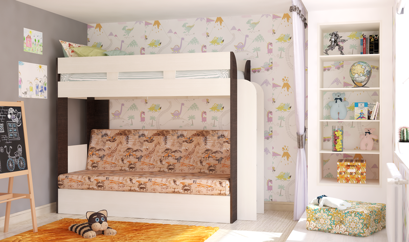 Двухъярусная кровать с диваном на первом уровне очень функциональна и удобно разместится влюбом интерьере.