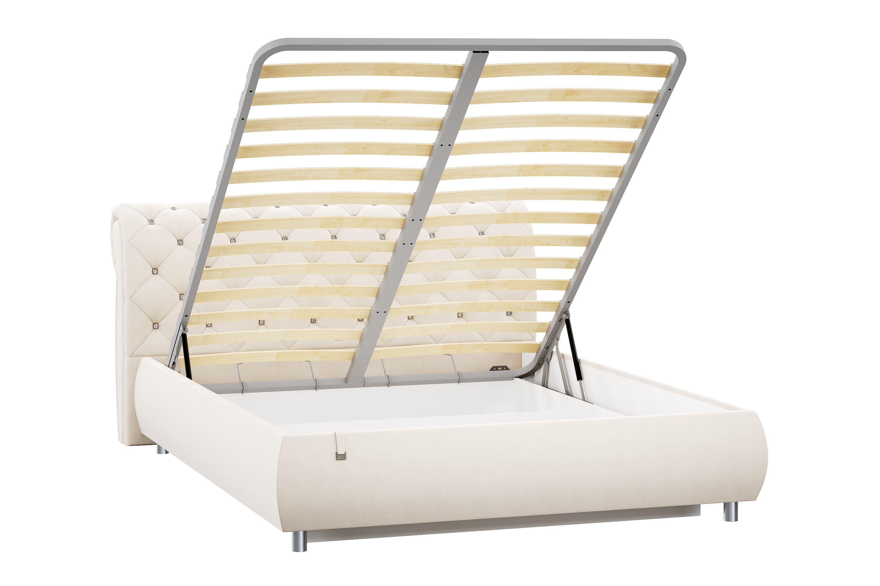 Ортопедическое основание оборудовано березовыми ламелями. Они обладают необходимой упругостью, которая позволяет прогибаться в зависимости от приложенной нагрузки. Реечное основание обеспечивает циркуляцию воздуха, что наилучшим образом сказывается на гигиенических свойствах матраса, в нем не будет скапливаться влага, пыль и запахи. Подъемный механизм легок в управлении.