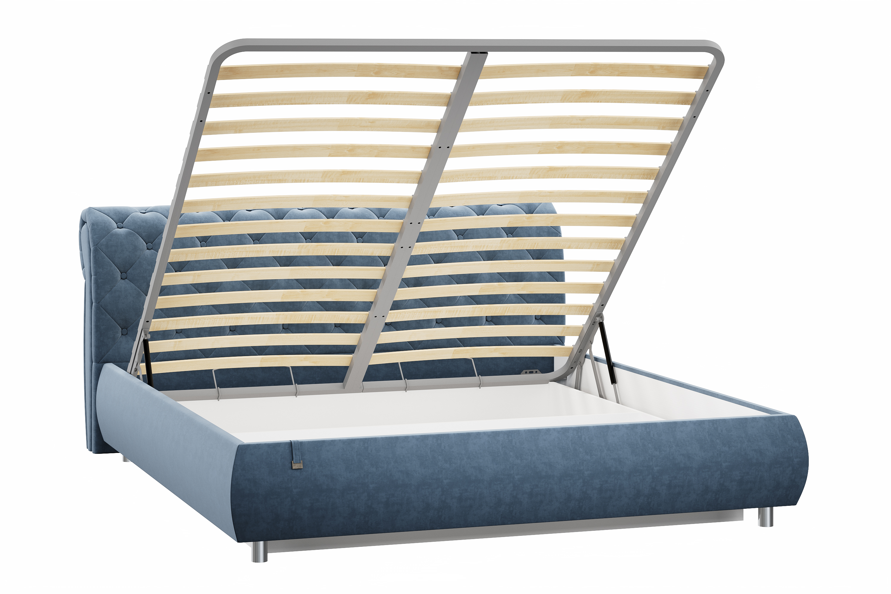 Ортопедическое основание оборудовано березовыми ламелями. Они обладают необходимой упругостью, которая позволяет прогибаться в зависимости от приложенной нагрузки. Реечное основание обеспечивает циркуляцию воздуха, что наилучшим образом сказывается на гигиенических свойствах матраса, в нем не будет скапливаться влага, пыль и запахи. Подъемный механизм легок в управлении.