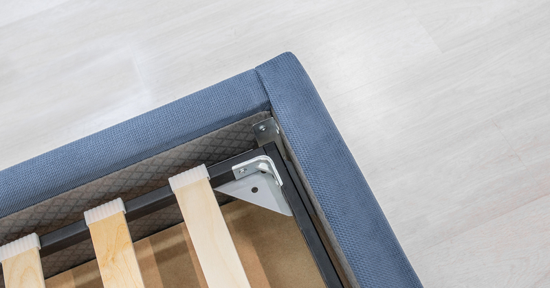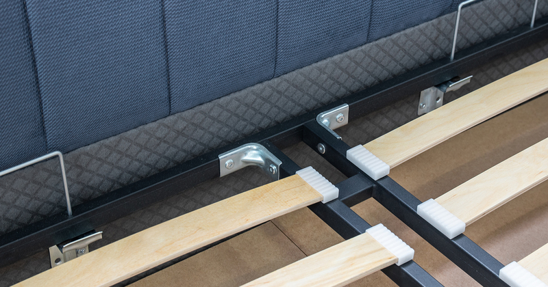 Основание кровати укомплектовано матрасодержателями. Жесткое кроватное дно из МДФ 6 мм. Задняя стенка изголовья выполнена в тех. ткани (спанбонд)