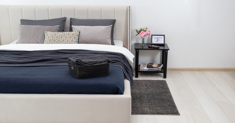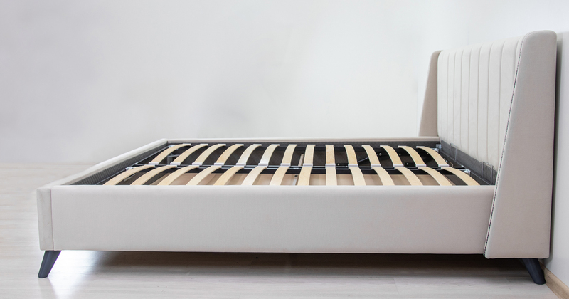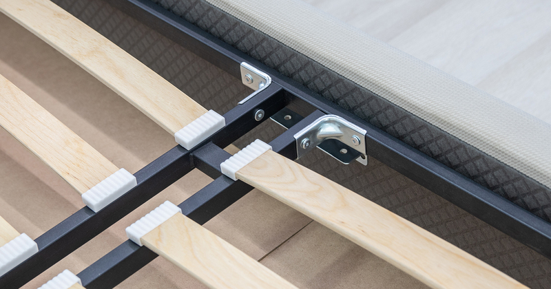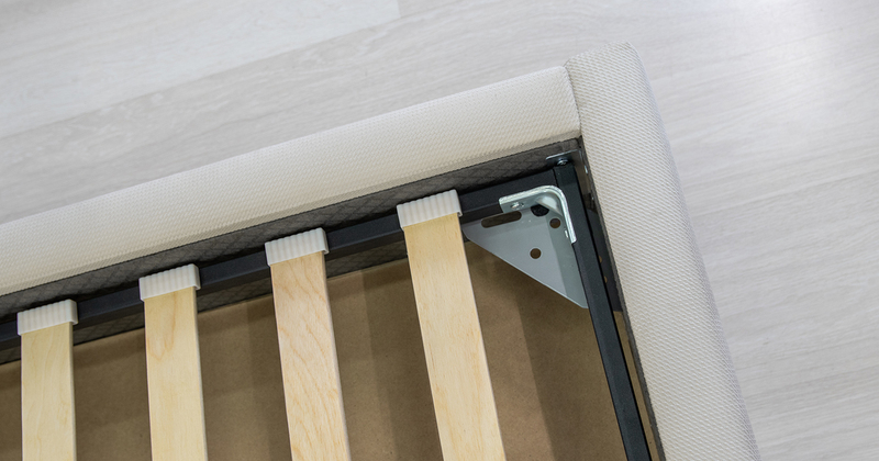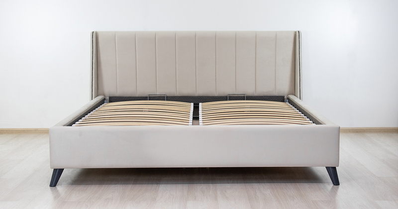 Основание кровати укомплектовано матрасодержателями. Жесткое кроватное дно из МДФ 6 мм. Задняя стенка изголовья выполнена в тех. ткани (спанбонд)