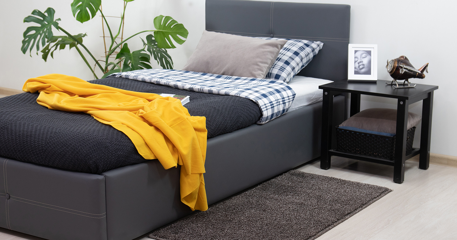 Кровать Миа 160 рогожка серый, кант желтовато-коричневый с ортопедическим основанием и подъемным механизмом