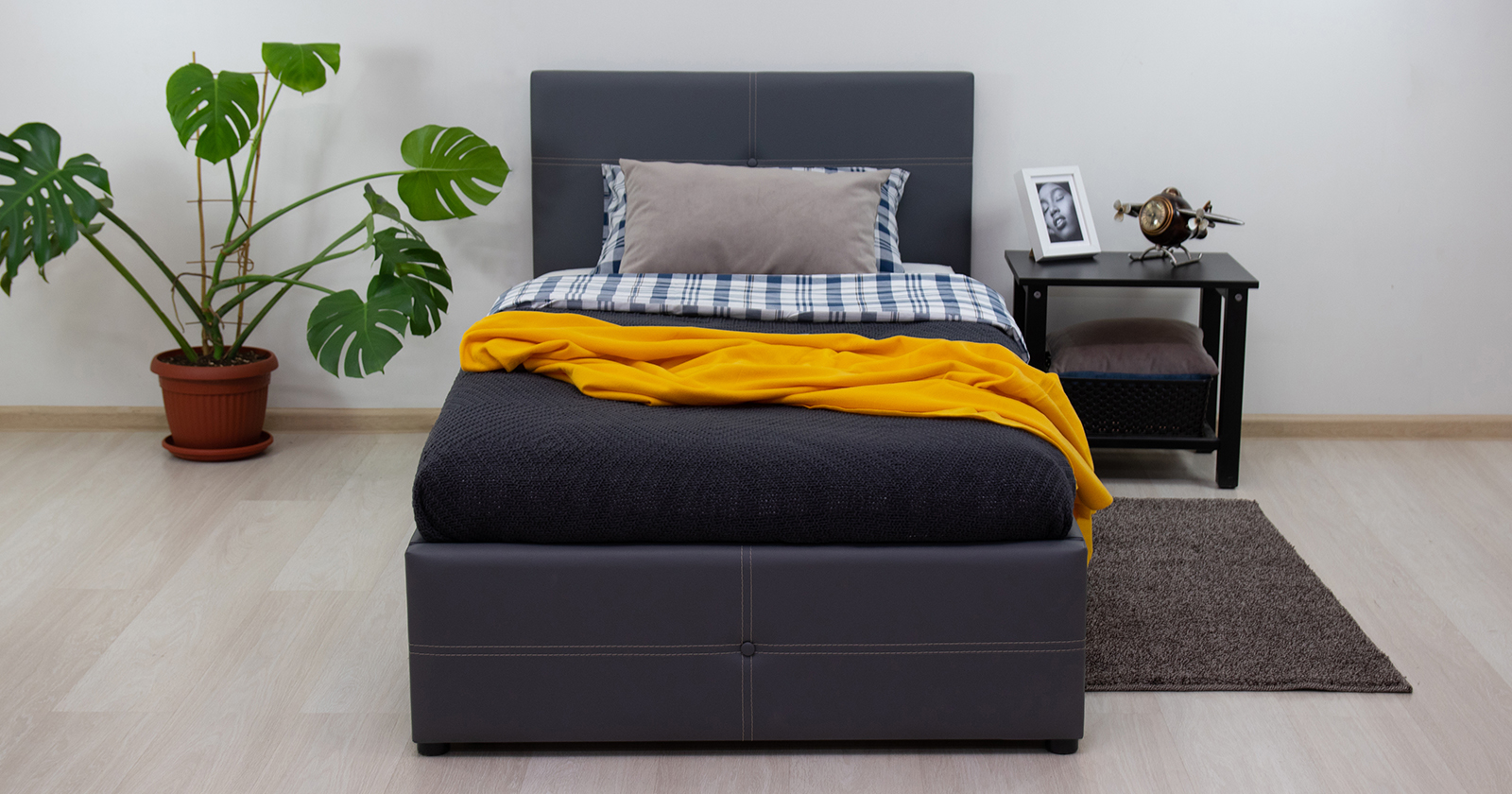 Кровать Миа 140 рогожка серый, кант желтовато-коричневый с ортопедическим основанием и подъемным механизмом