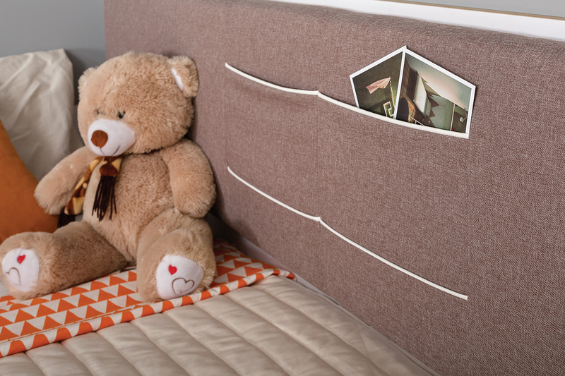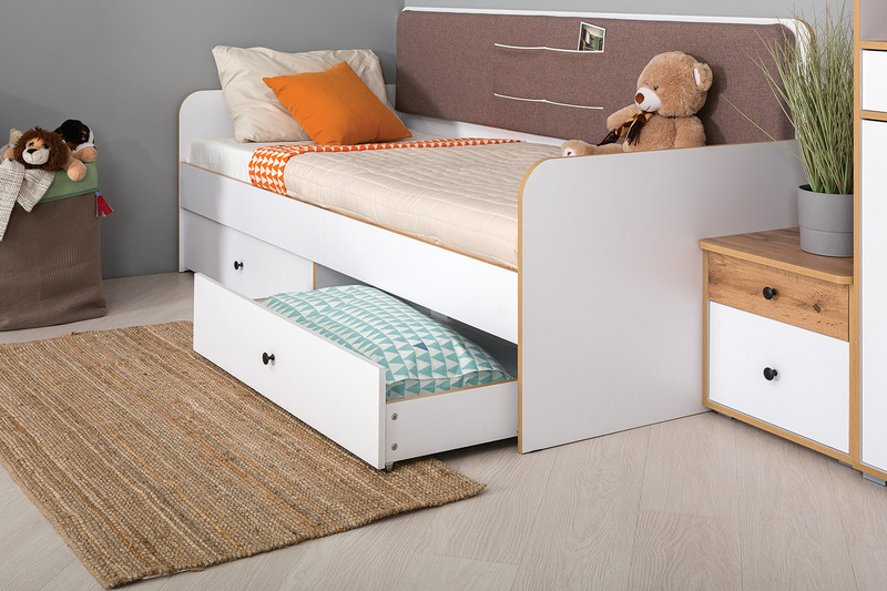 Кровать детская Вуди 11.02 белый премиум, дуб золотой CRAFT, саванна латте, эко 100 кожзам гранд белый