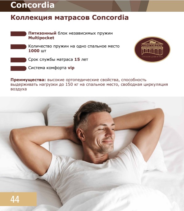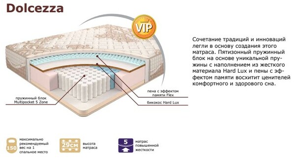 Сочетание традиций и инноваций легли в основу создания этого матраса. Пятизонный пружинный блок на основе уникальной пружины с наполнением из жесткого Hard Lux и пены с эффектом памяти восхитит ценителей комфортного и здорового сна. Матрас объединяет в себе все лучшие свойства материалов, специально созданных для достижения максимального комфорта и уюта. Надежная внутренняя конструкция матраса обеспечивает отличную поддержку позвоночника. А высокоэластичная суперпена с эффектом памяти создает непревзойденное ощущение невесомости и легкости. Особенную прохладу, свежесть и мягкость придает матрасу Concordia Celenzio чехол, выполненный из трикотажа с волокнами вискозы и пропитанный ионами серебра. Погружаясь в сказочный волшебный сон, Вы будете чувствовать лишь нежность, легкость и беззаботность.