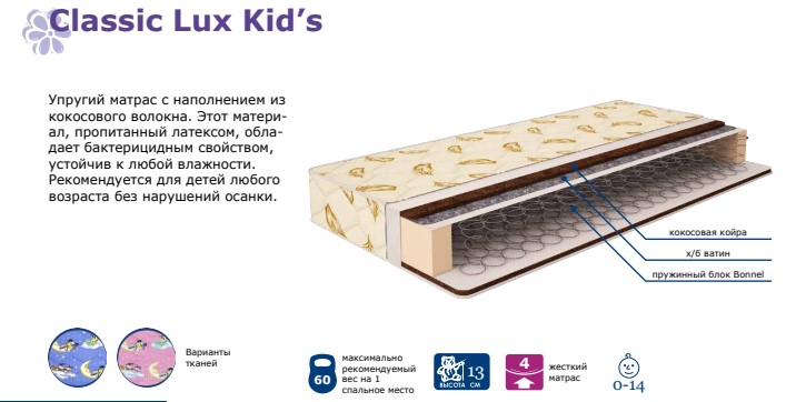 Идеальный матрас, сочетающий в себе два важнейших критерия "цена-качество", данный матрас имеет степень жесткости - 4 из 5, что достигается благодаря свойствам кокосовой койры. Этот природный  материал, пропитанный латексом, обладает бактерицидным свойством, устойчив к любой влажности и сохраняет свои характеристики в течение многих лет.