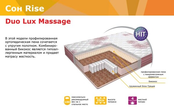 В этой моделе профилированная ортопедическая пена сочетается с упругим полотном. Комбинированный би-кокос является гипоаллергенным материалом и придает матрасу жесткость.