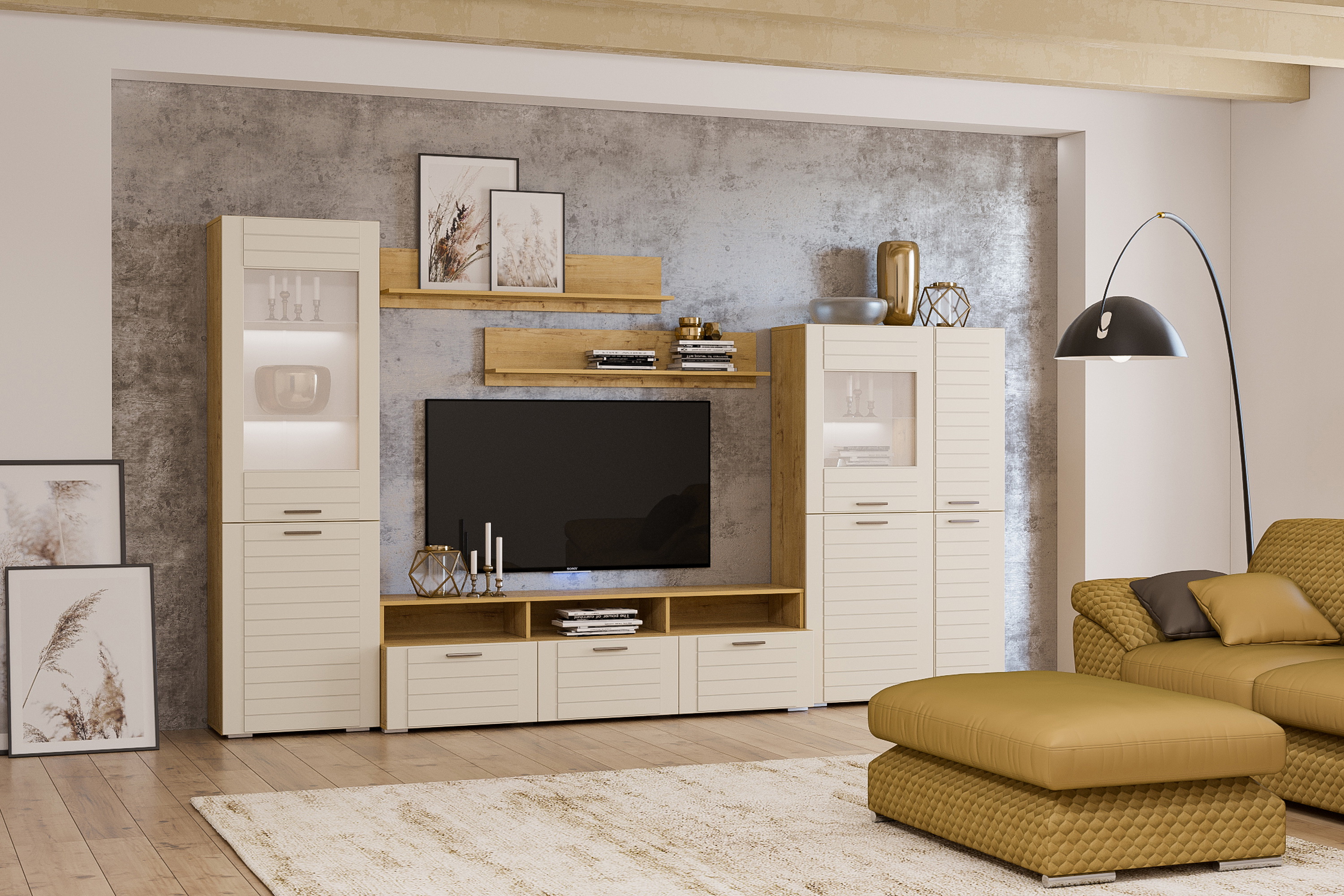 Тумба под ТВ в гостиную Вайс 13.270.01 дуб золотой CRAFT, милк софт ПВХ, темно-серый