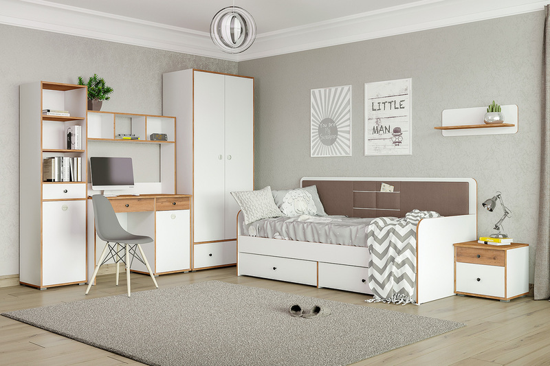 Кровать детская Вуди 11.02 белый премиум, дуб золотой CRAFT, саванна латте, эко 100 кожзам гранд белый