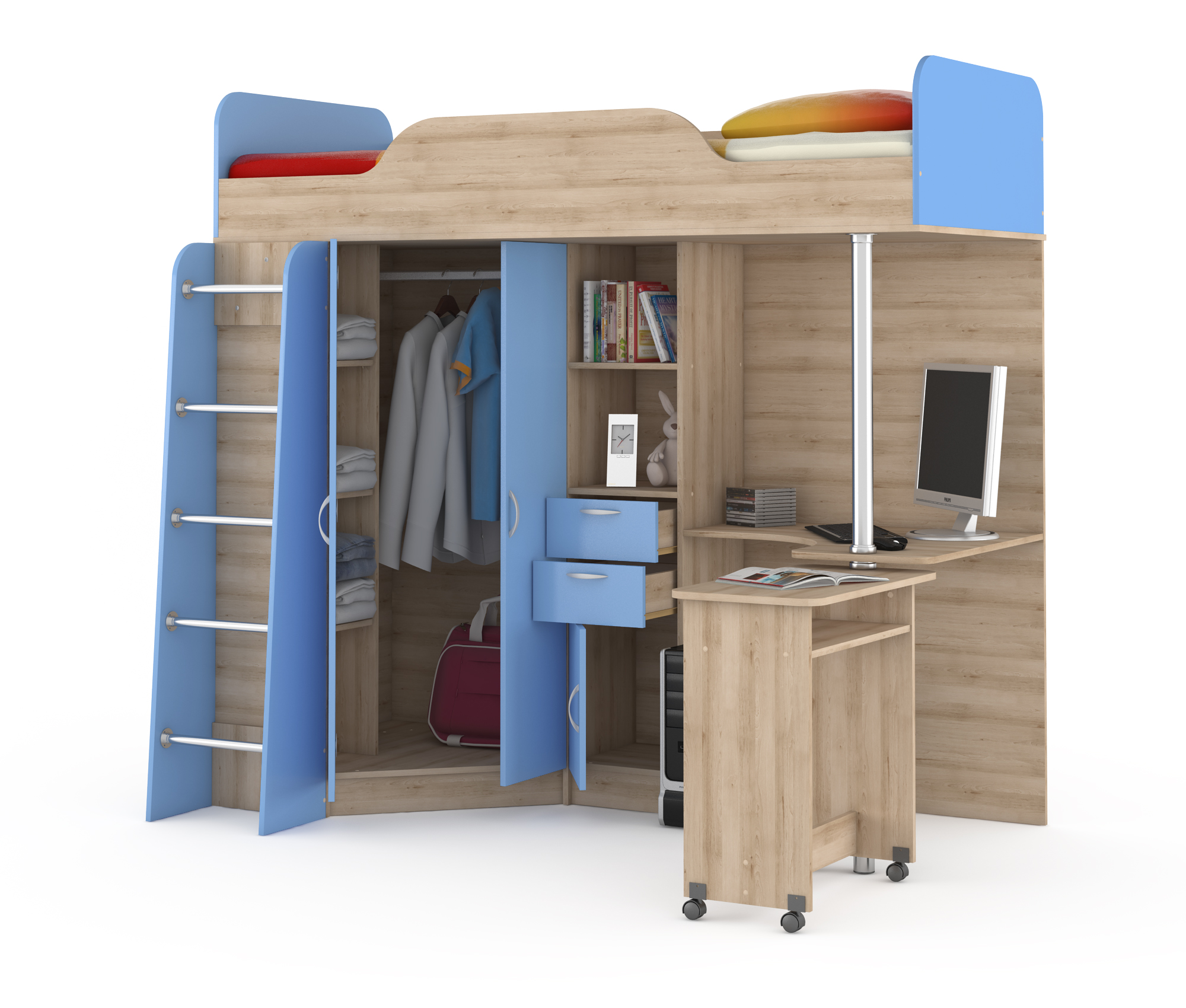 Кровать-чердак со столом Ника 427 Т бук песочный капри синий