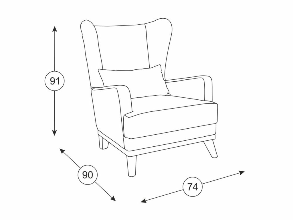 Высокая спинка с наклоном и мягкие подлокотники обеспечивают удобную посадку, дополнительный комфорт создает декоративная подушка. Царга кресла обтянута искусственной кожей в цвет опорам.