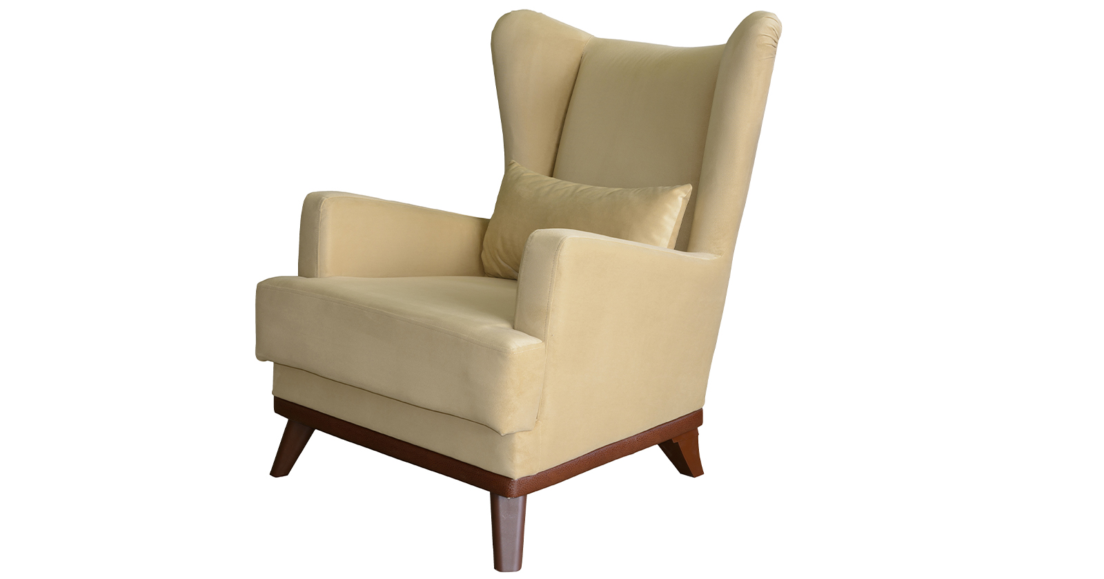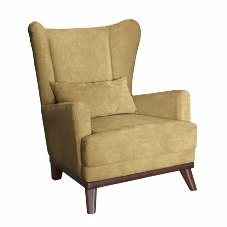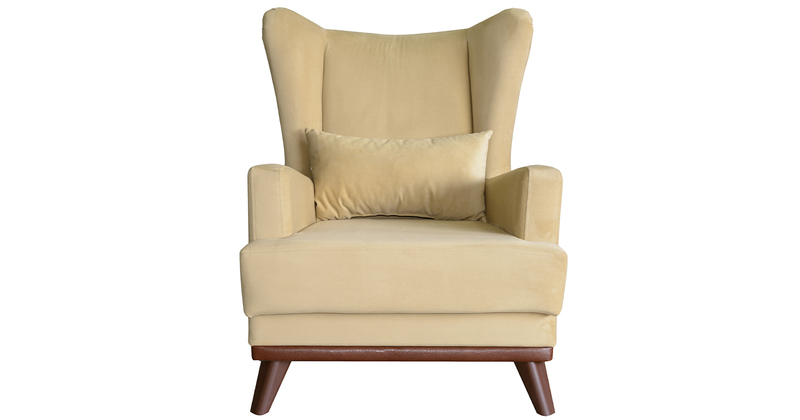 Высокая спинка с наклоном и мягкие подлокотники обеспечивают удобную посадку, дополнительный комфорт создает декоративная подушка. Царга кресла обтянута искусственной кожей в цвет опорам.