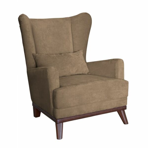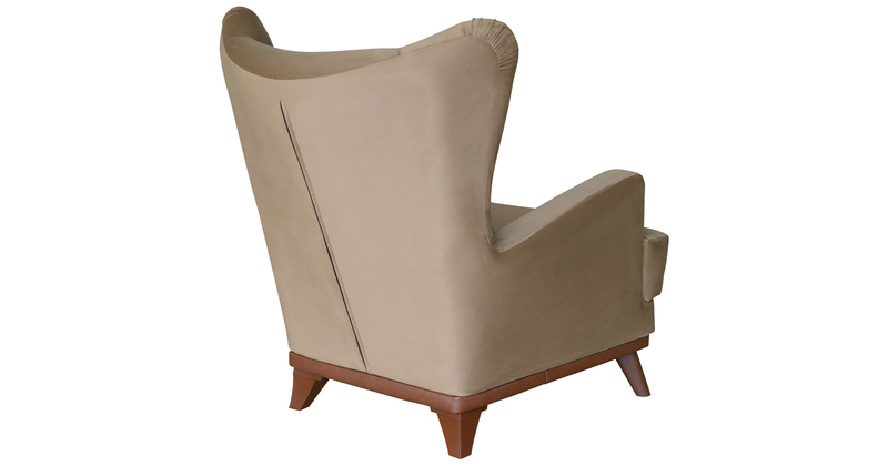 Высокая спинка с наклоном и мягкие подлокотники обеспечивают удобную посадку, дополнительный комфорт создает декоративная подушка. Царга кресла обтянута искусственной кожей в цвет опорам.