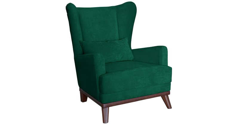Высокая спинка с наклоном и мягкие подлокотники обеспечивают удобную посадку, дополнительный комфорт создает декоративная подушка. Царга кресла обтянута искусственной кожей в цвет опорам.