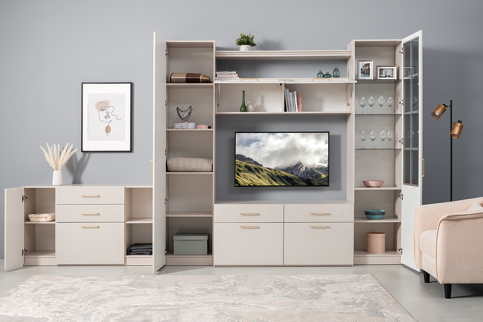Фрезерованные фасады из МДФ, металлические ручки и витрины с тонированным стеклом создают изысканный образ.