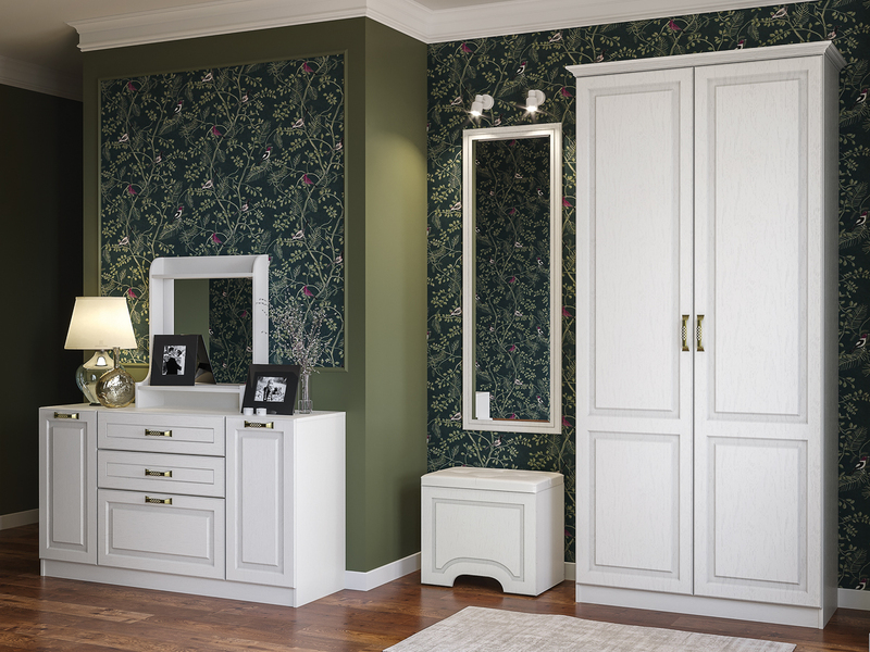 Выдвижные ящики на шариковых направляющих полного выдвижения. Искусственная кожа белого цвета. Зеркало 4 мм с фацетом 10 мм. Комплект карнизов 1000 приобретается отдельно. Пуф на колесах, подъемная крышка.