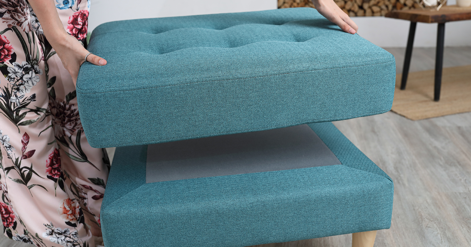 Пуф имеет съемную подушку сиденья, крепящуюся к основанию на липучках. Подушка со съемным чехлом на молнии, что многократно облегчает уход за мебелью.