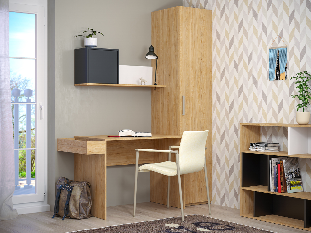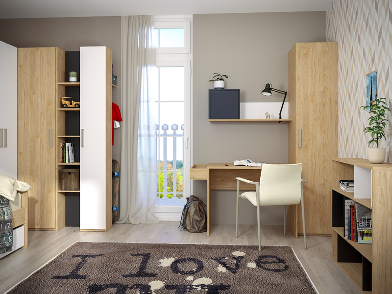 Модульная система Гравити имеет необычное цветовое решение: в качестве акцента выступает монохромная гамма, которая, сочетаясь с тёплым древесным декором, даёт необходимую графичность, но не портит внешний вид пестротой и агрессивностью. Этот дизайн не имеет границ по возрасту и полу, а это означает, что Гравити подойдёт очень большому числу покупателей. Развитая система хранения в сочетании с уникальными конструктивными решениями позволяет решить все проблемы с уборкой детских вещей.