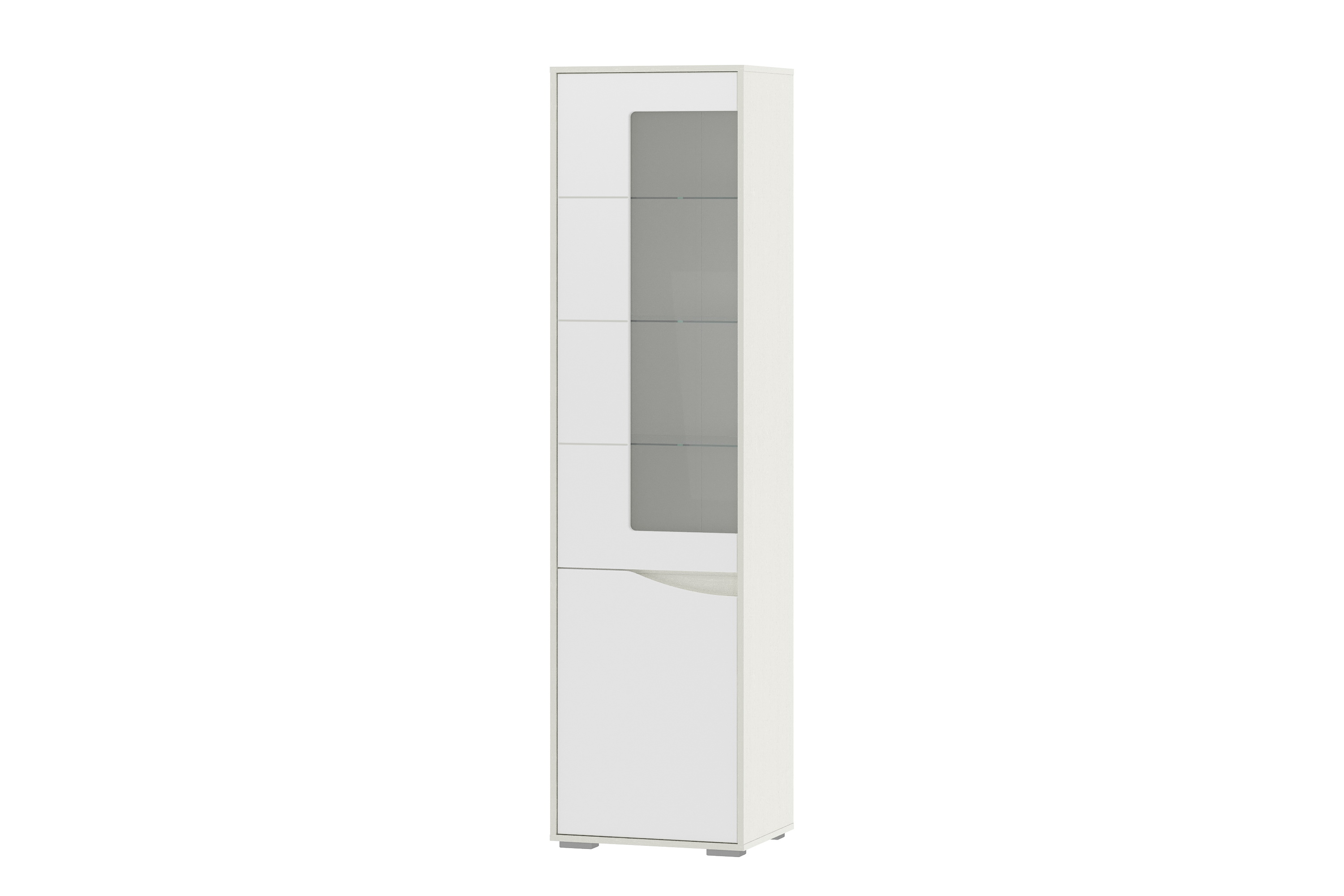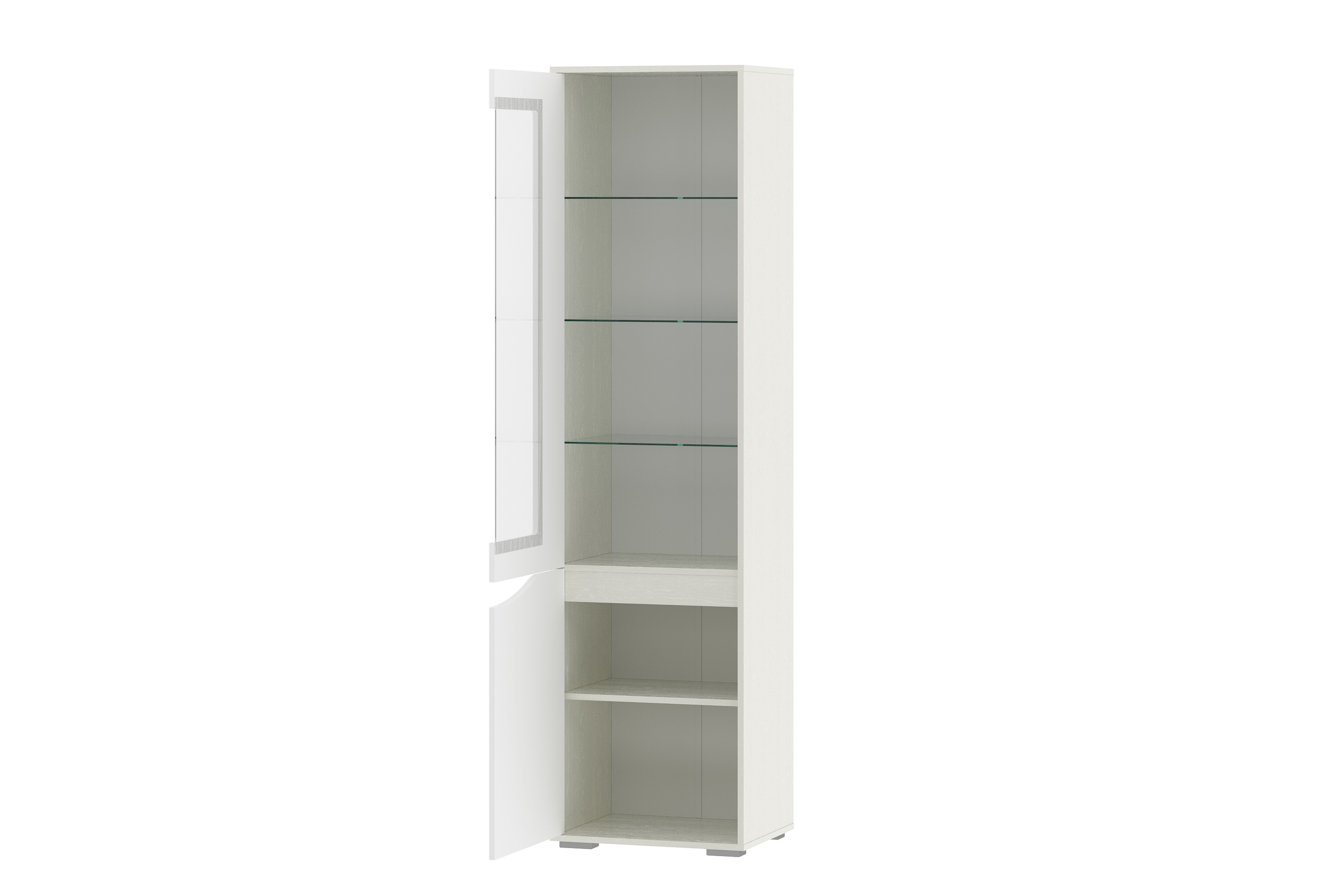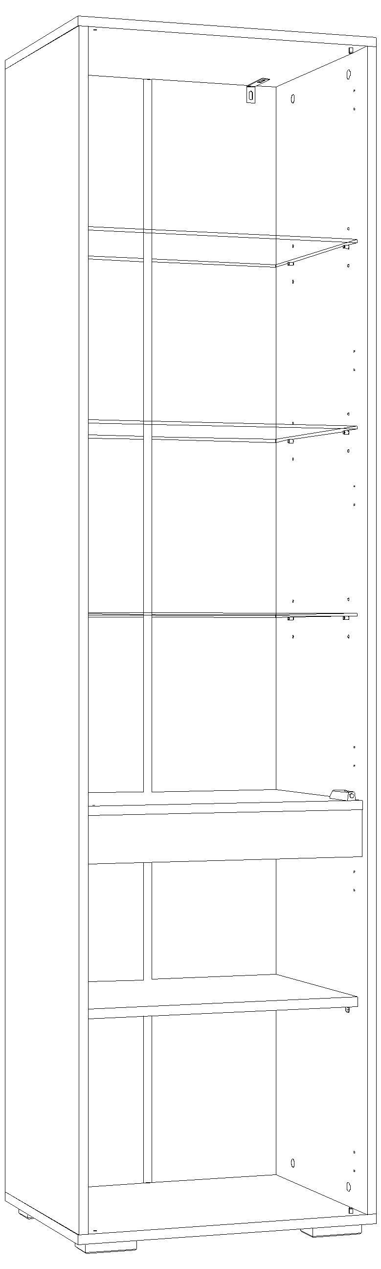 Фурнитура: Шкаф собирается с помощью шкантов, эксцетриковых стяжек и дюбелей быстрого монтажа. Полки из ЛДСП 16 мм на фиксирующих полкодержателях. Полки из стекла 5 мм на полкодержателях с кембриком. Опоры регулируемые №01 "Риальто". Петли вкладные Gelony. Ручка нижнего фасада интегрированная. Механизм открывания Hettich Push to open. Все видимые отверстия закрываются заглушками в цвет корпуса.