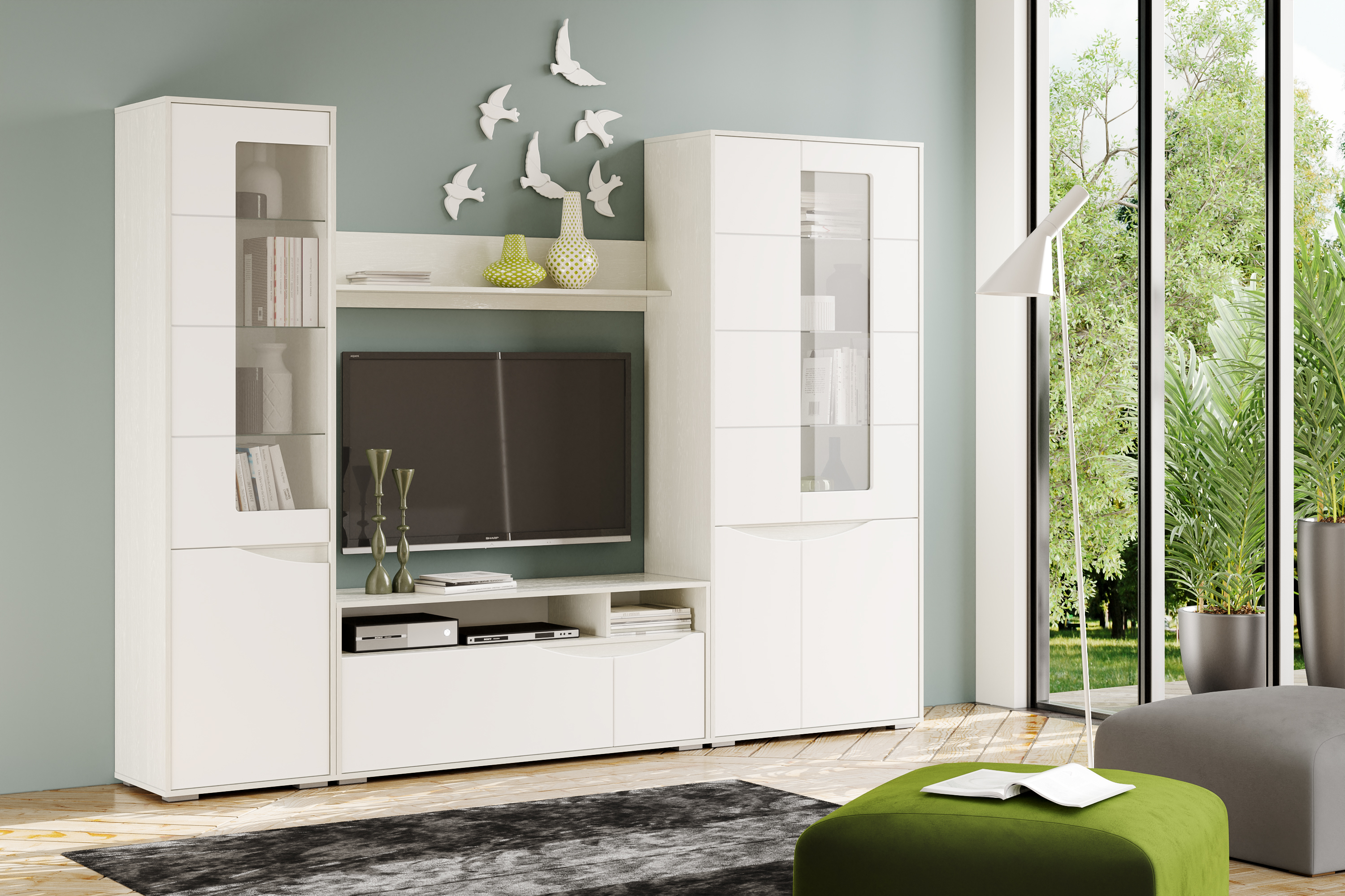 Материалы: Корпус - ЛДСП 16 мм. Торцы деталей облицованы кромкой ПВХ 0,4 мм. Полки: ЛДСП 16 мм; стекло 5 мм со шлифовкой кромок. Задняя стенка - ДВПО марки ТСН белого цвета, накладная, крепится шурупами. Фасады - МДФ 16 мм, облицованная пленкой ПВХ. Вставка в фасад-витрину - стекло 4 мм "Мателюкс", накладная, крепится с обратной стороны фасада с помощью стеклодержателей и шурупов.