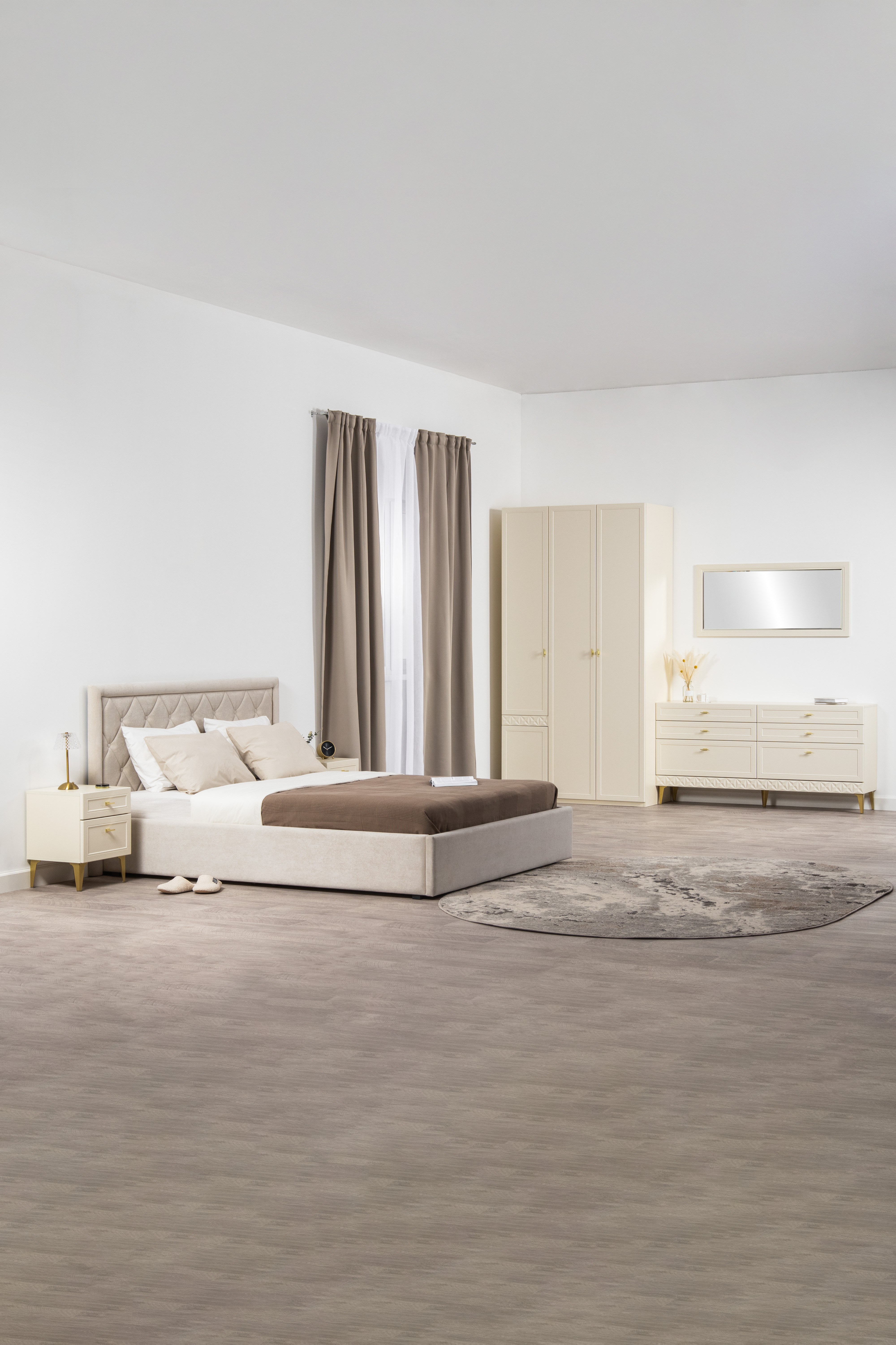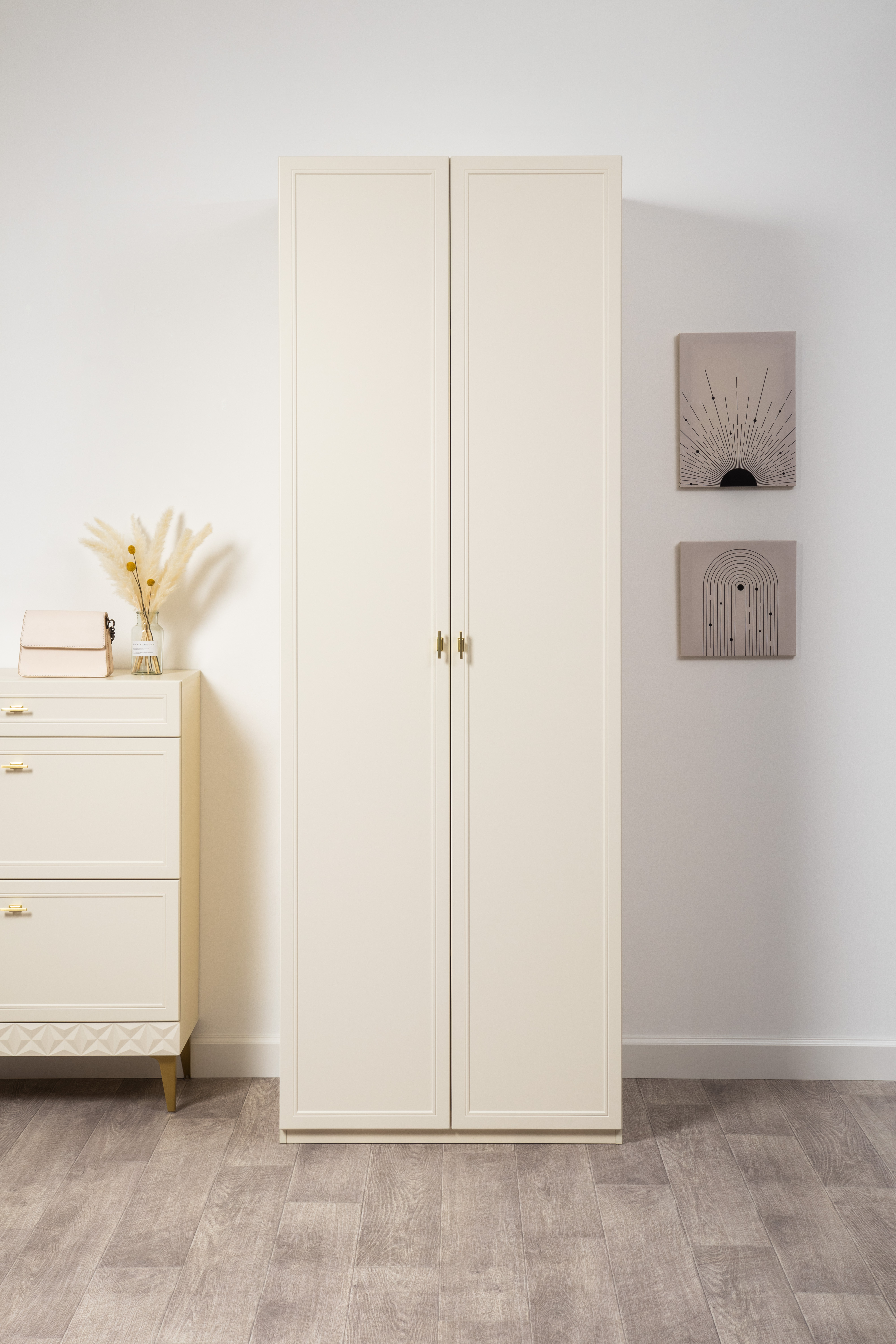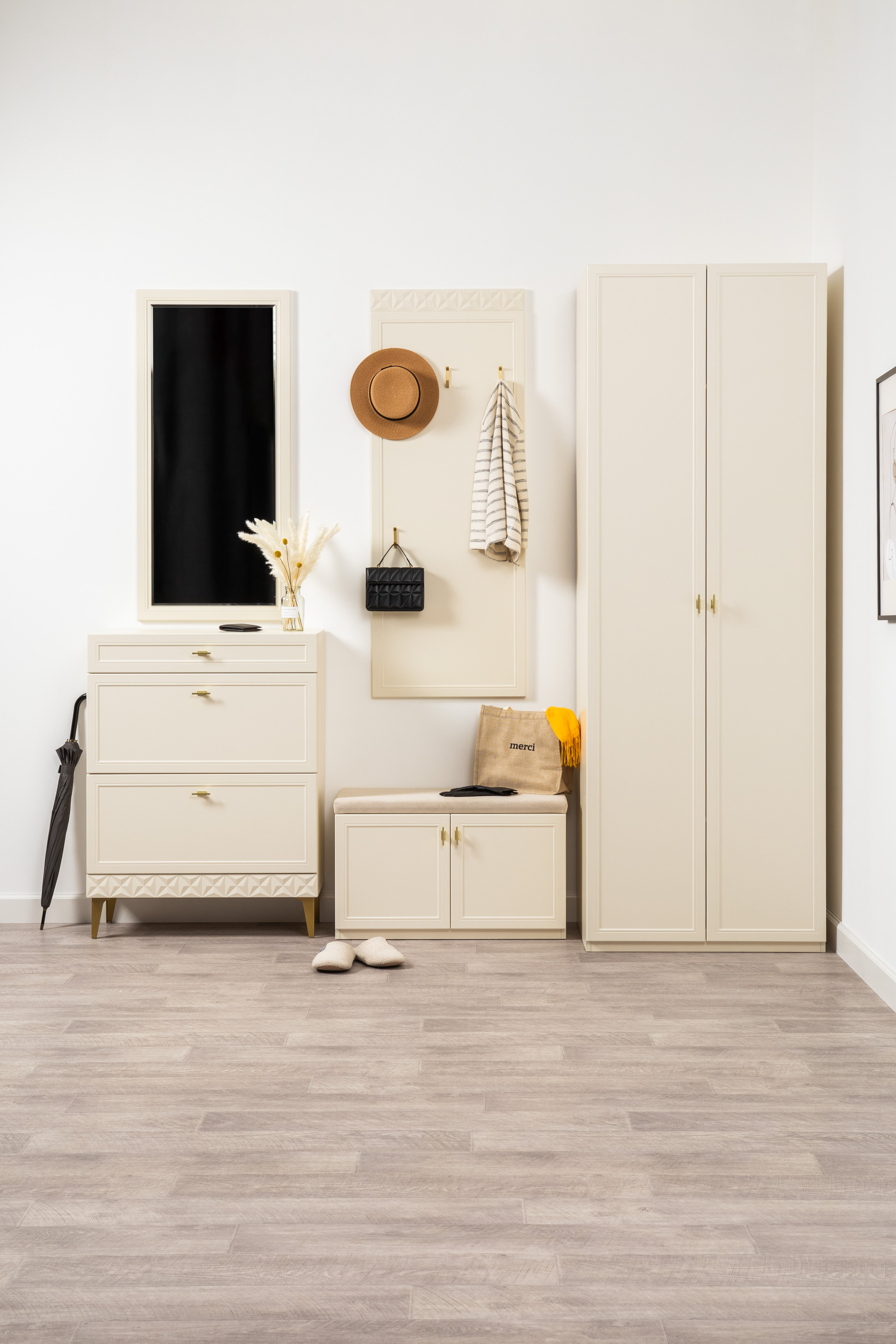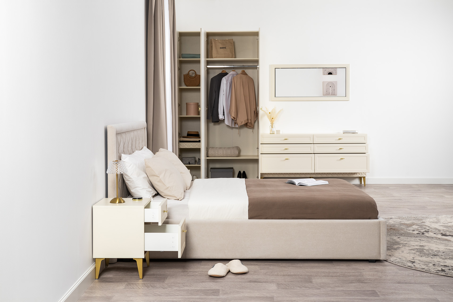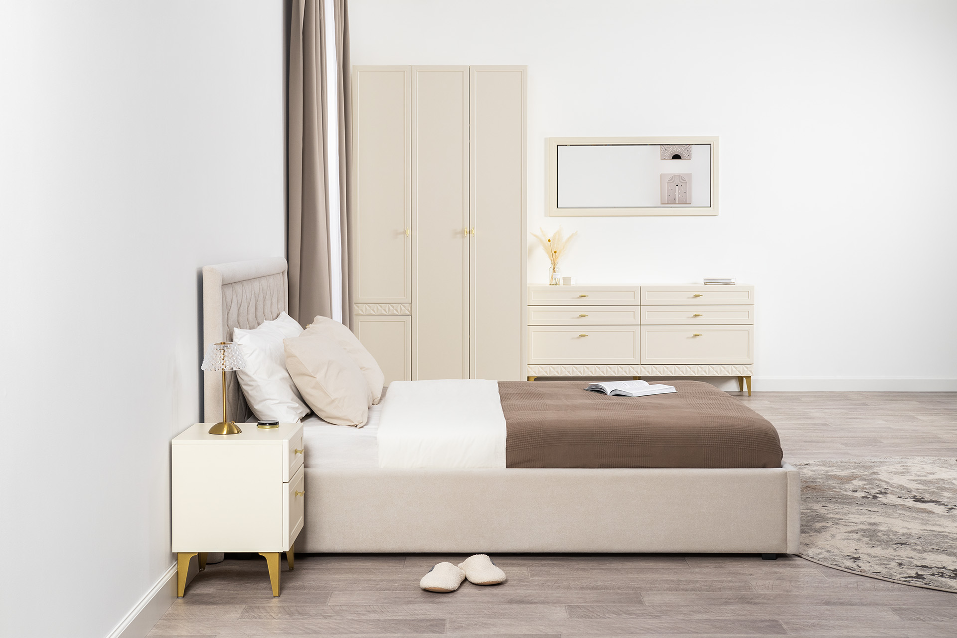 Изящные линии, глубокая фрезеровка фасадов из МДФ и благородные оттенки. Утончённая «Слоновая кость» и изысканная «Олива Шагрень» с глубоким зелёным тоном — создают атмосферу уюта, тепла и благородства. Металлические ручки и опоры золотого цвета придают мебели утончённый блеск, а петли и направляющие с доводчиками обеспечивают плавное и бесшумное закрытие фасадов.