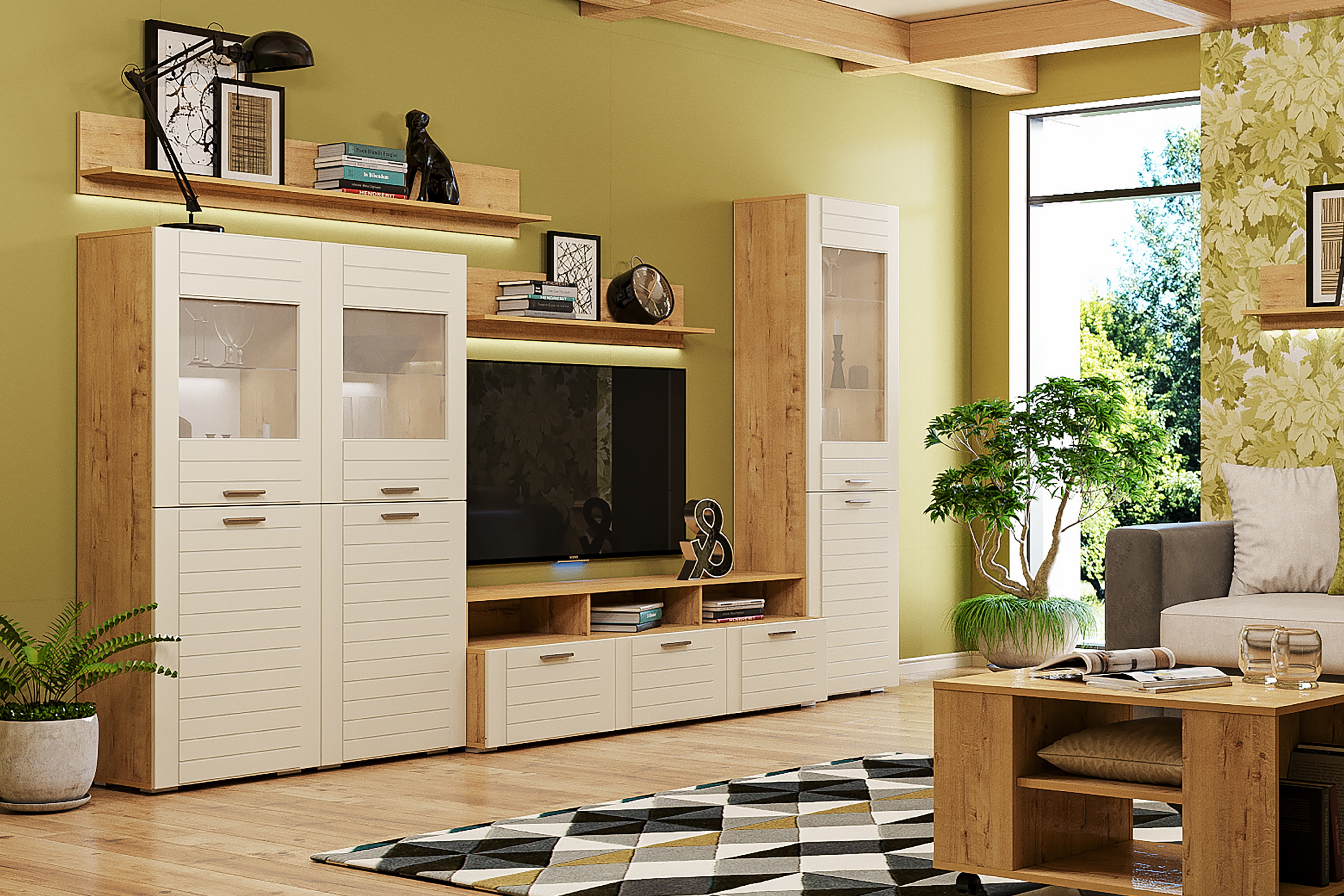 Компактный шкаф Livorno НМ 011.49 подходит для малогабаритной гостиной. Верхняя створка декорирована стеклянным элементом, который делает практически невидимыми вещи, находящиеся за ним. Внутри этой части модуля установлены две стеклянные полки. Нижняя секция модуля оснащена двумя полками, содержимое которых защищено от пыли глухим фасадом.